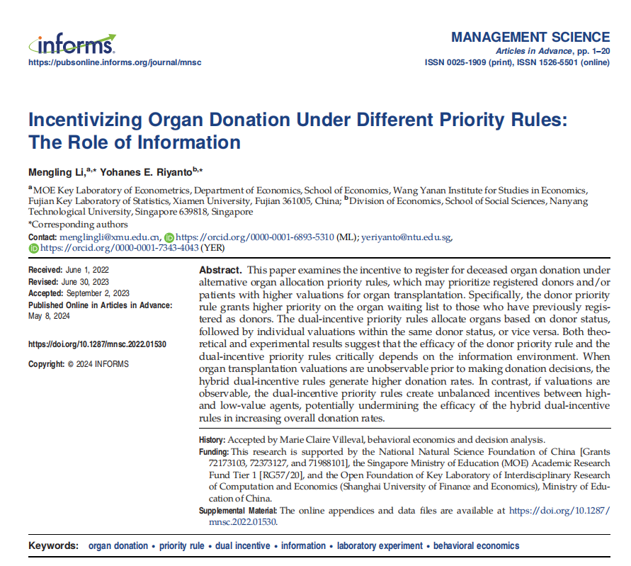 Recently, the paper “Incentivizing Organ Donation Under Different Priority Rules: The Role of Information” co-authored by Mengling Li, Associate Professor of the Department of Economics, School of Economics and Wang Yanan Institute for Studies in Economics (WISE), Xiamen University, and Yohanes E. Riyanto, Professor of Nanyang Technological University, Singapore, has been published online in Management Science, a top international journal of management science. The paper is one of the important achievements of the Basic Science Center for Econometric Modelling and Economic Policy Studies, National Natural Science Foundation of China.