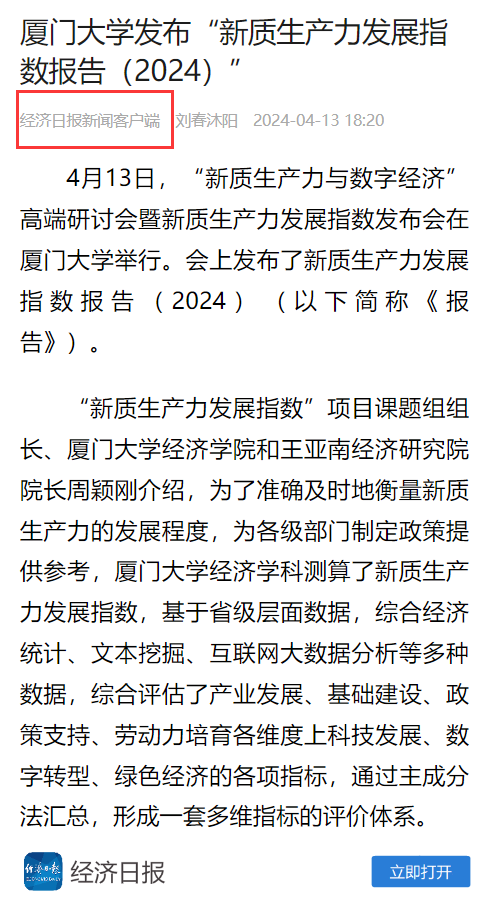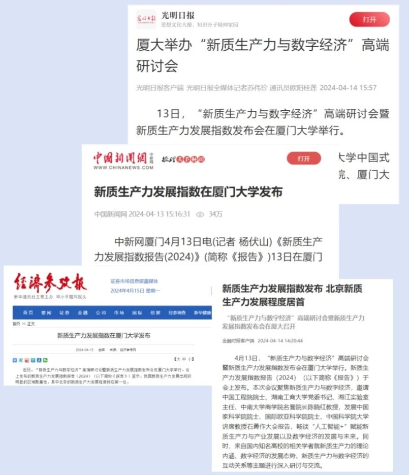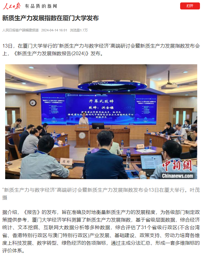 4月13日,由厦门大学经济学科和厦门大学中国式现代化研究院联合主办的“新质生产力与数字经济”高端研讨会暨新质生产力发展指数发布会在厦大经济楼举行。由厦大经济学科编制的新质生产力发展指数报告(2024)(下简称《报告》)于会上发布,引国内多家媒体关注,形成了报刊、电视、广播,以及新媒体平台的立体式报道。
