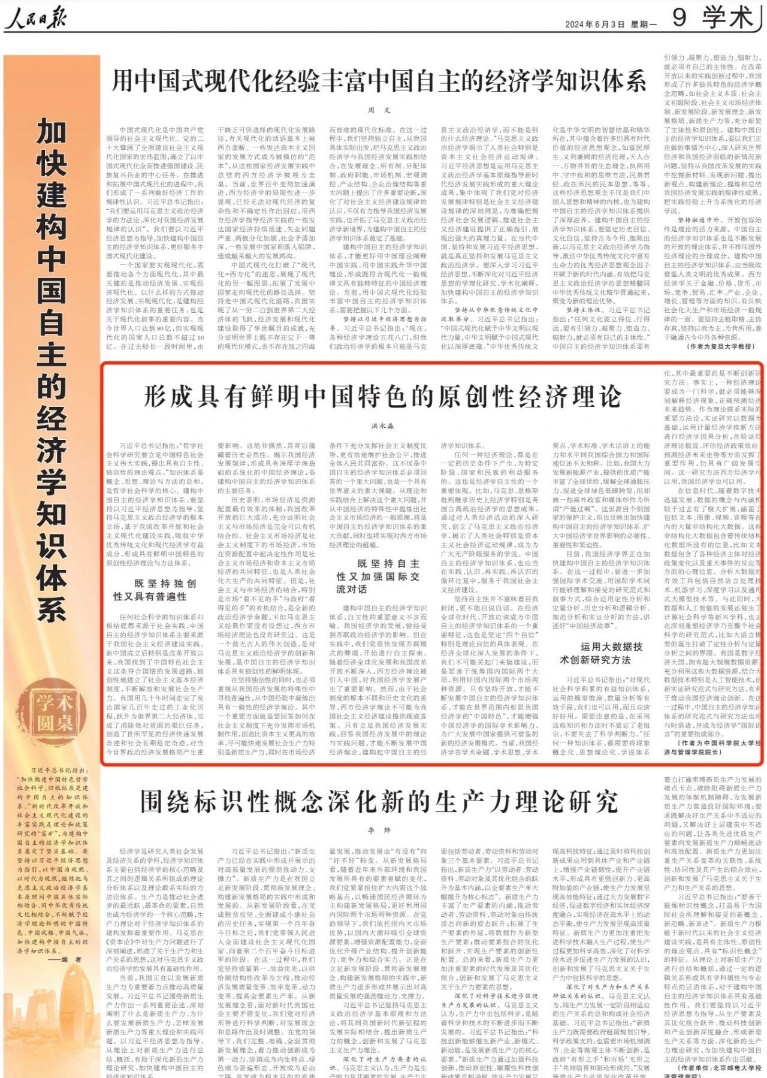 2024年6月3日《人民日报》第9版(学术版)发表“加快建构中国自主的经济学知识体系(学术圆桌)”,其中包含洪永淼教授的文章《形成具有鲜明中国特色的原创性经济理论》。