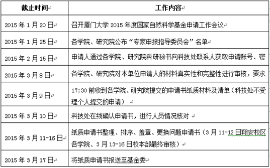 2、自2013年起,我校需接收思明和翔安两个校区的基金申请,因此请申请人和所在学院严格遵守申报的时间节点,科技处也将在翔安校区进行集中受理和审查,具体时间节点请见附件“厦门大学2015年度国家自然科学基金申请组织工作进度表”;