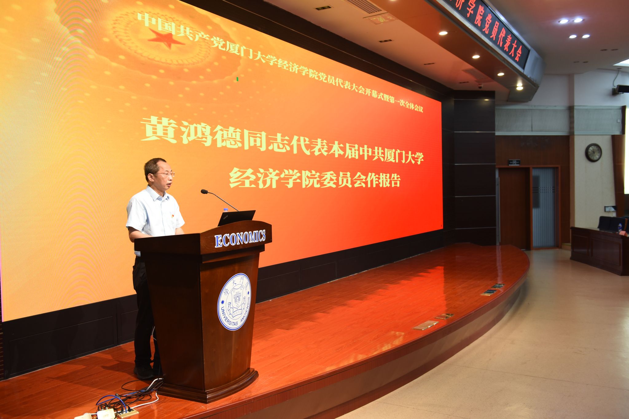 大会在庄严的国歌声中拉开帷幕。经济学院党委书记黄鸿德代表学院党委向大会作题为《牢记嘱托砥砺奋进 知行合一追求卓越——为建设中国特色、世界一流经济学科矢志奋斗》的报告。