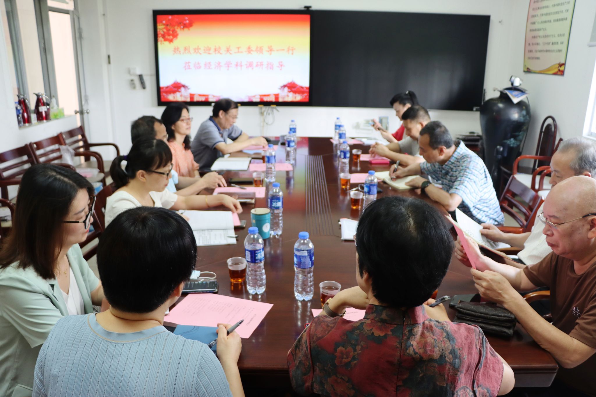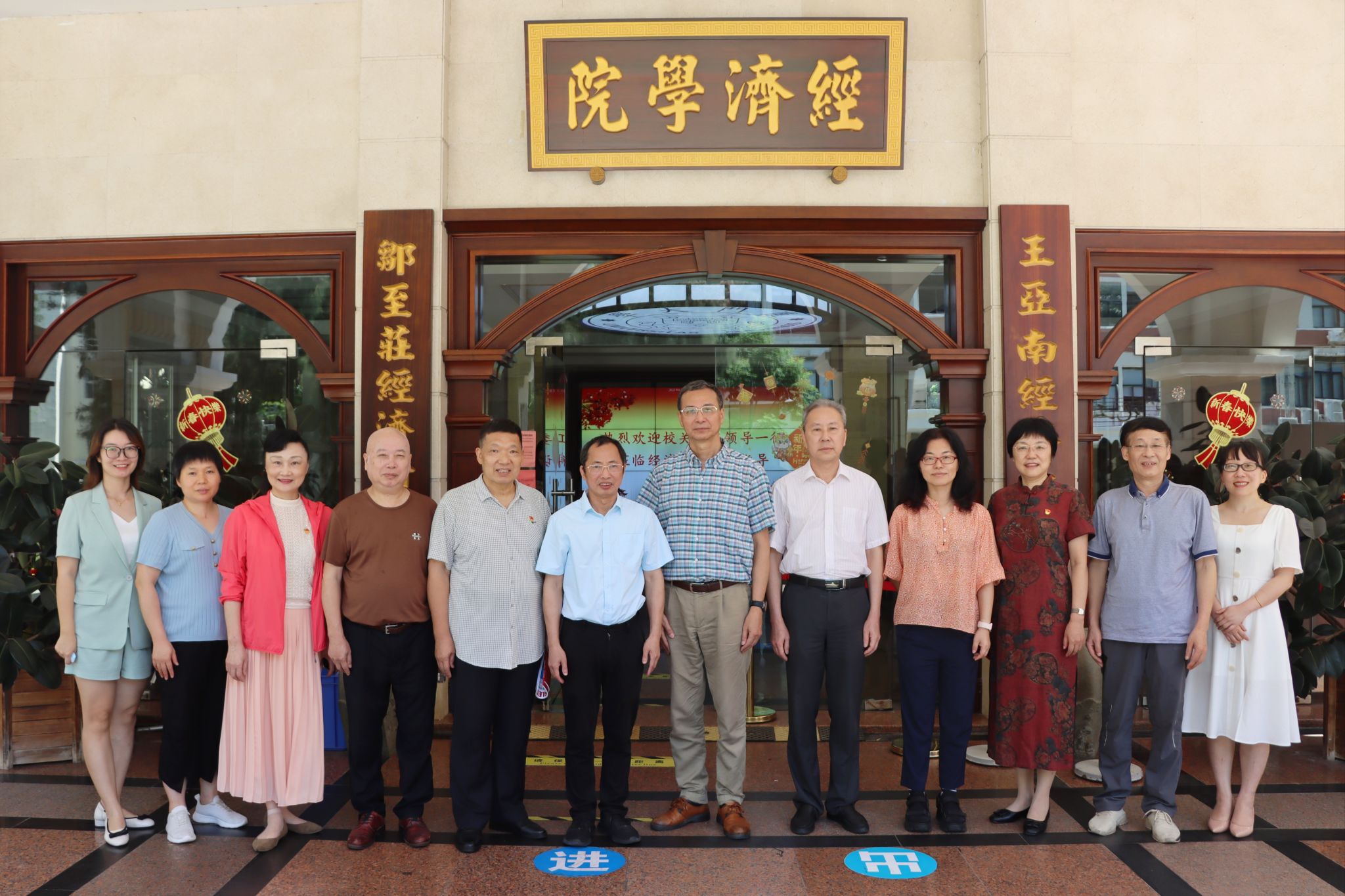 2022年6月29日上午,校关工委常务副主任赖虹凯, 副主任白锡能、苏劲、邵鹏飞、侯莲娜和秘书张红疆一行到经济学科调研工作。经济学院党委书记、关工委主任黄鸿德,党委副书记、关工委副主任周蕾,关工委委员朱国清、刘莉颖、赵小姝和秘书王婉琼参加了调研座谈会。