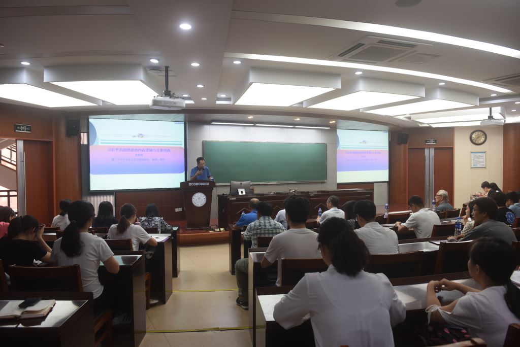 张艳涛以《习近平治国理政的内在逻辑与主要风格》为题,从国际、国内背景趋势的变化引出世界之问与中国智慧、中国方案,主要从执政主题、执政目标、执政理念、执政方略、执政任务、执政情怀等六个方面进行讲述。他认为,领导人的政治品格是历史形成的,习近平的治国理政思想同样是在其长时期的执政实践中逐渐形成并日益成熟的。他向大家介绍了习近平同志的政治成长经历,阐述了中国共产党的执政主题是把马克思主义的普遍真理同中国的具体实践结合起来,坚持和发展中国特色社会主义。中国逐渐走近世界舞台的中心,中国共产党的执政任务是引领中国由“大国”迈向“强国”,以“民族复兴、国家富强、人民幸福的‘三位一体’”的执政理念,“四个伟大”与中国崛起的执政方略,努力实现“两个一百年”奋斗目标和中华民族伟大复兴的中国梦的执政目标。中国共产党的执政情怀是不忘初心,继续前进。中国共产党人的初心和使命,就是为中国人民谋幸福,为中华民族谋复兴。办好中国的事情,关键在党。全体共产党人要以“等不起”的紧迫感、“慢不得”的危机感、“坐不住”的责任感,紧密团结在以习近平同志为核心的党中央周围,继续朝着实现中华民族伟大复兴的宏伟目标奋勇前进。