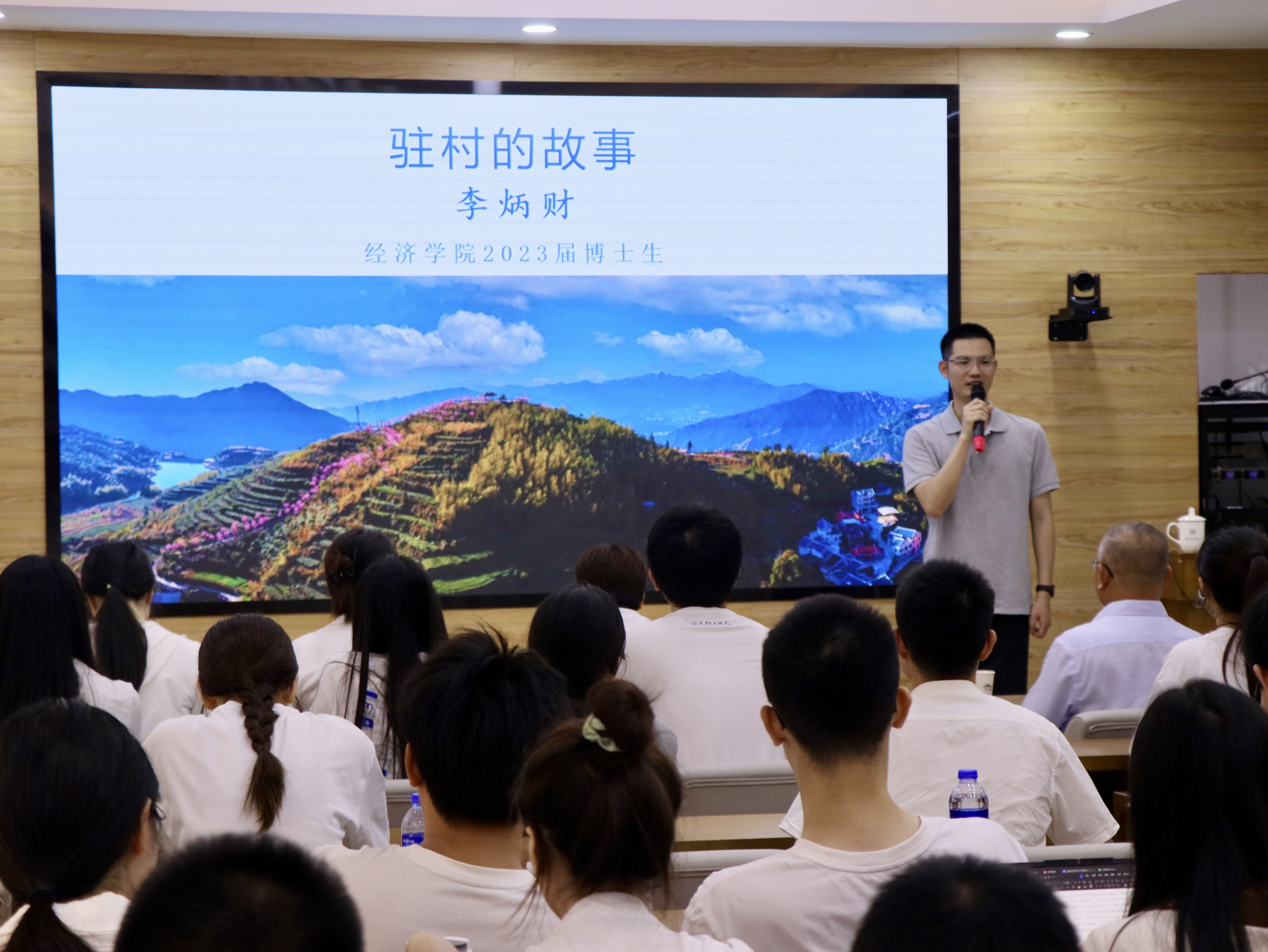 本次实践学习还邀请到了经济学院2023届博士毕业生、福建省选调生、白交祠村党总支书记助理李炳财为师生党员分享驻村工作经历与心得。他从驻村故事讲起,从防台防汛到与村民深切交流,从对外宣传到推进文旅产业发展,他深刻感受到基层干部要学会“穿针引线”,承上启下,落实方针政策、共谋百姓福祉。学生党员们积极提问,热烈交流,交流会激发了学生党员把小我融入大我、投身扎根基层的青春豪情。