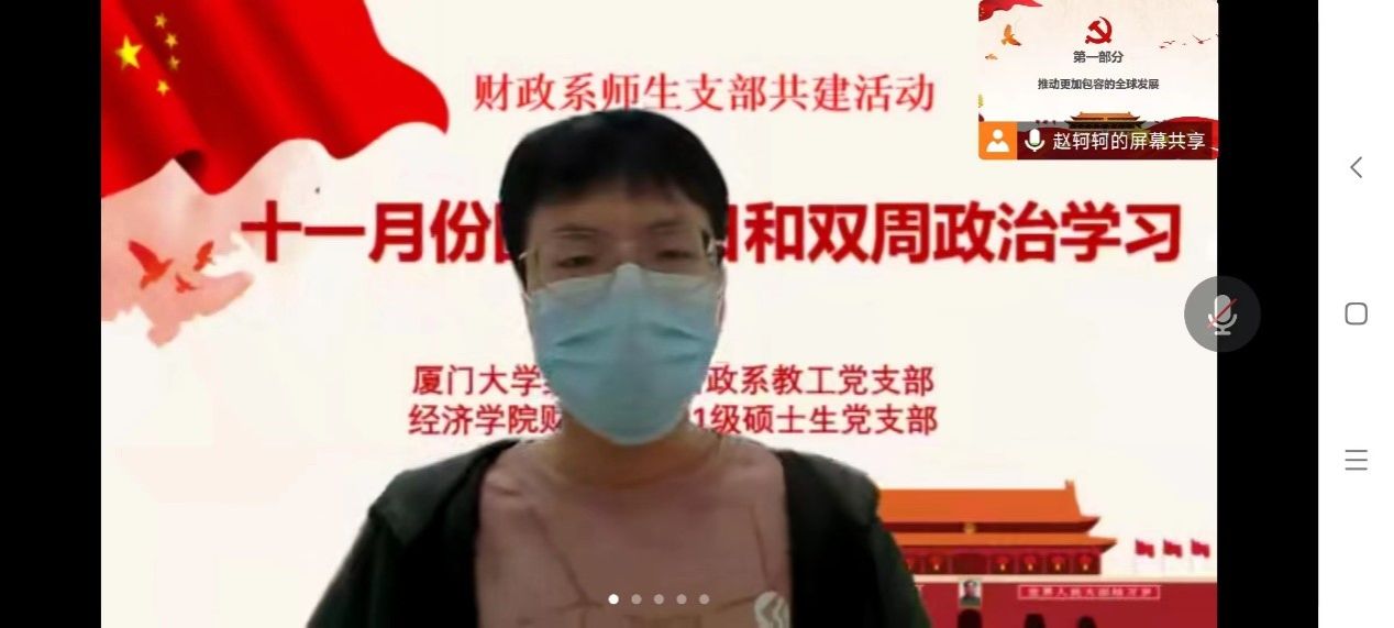 2022年12月12日中午,经济学院财政系教工党支部与财政系2021级硕士生党支部在学生社区联合开展学习宣传贯彻党的二十大精神主题党日活动。本次活动采取线上和线下相结合的形式进行。财政系全体教师线上参与;学生党员于学习共享空间海韵9党团活动室线下参加。会议由教工支部书记刘晔老师主持。