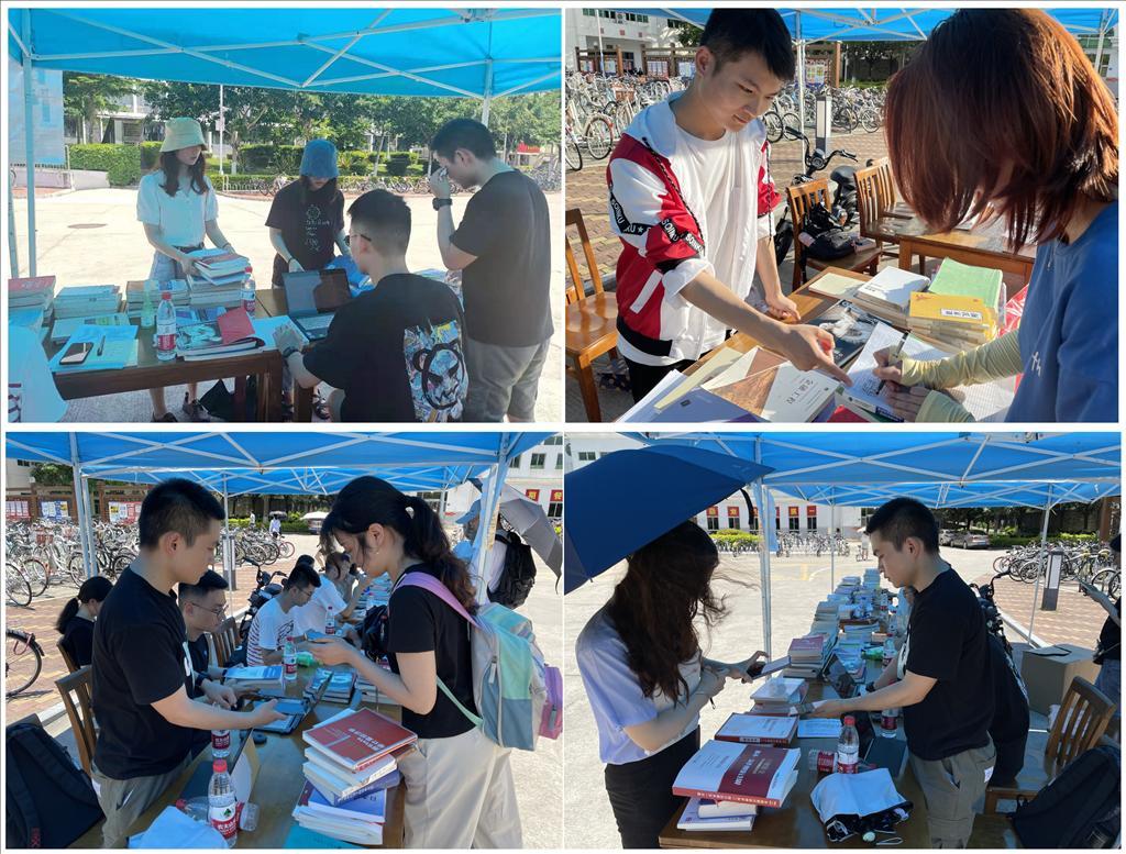 在当天的海韵一期活动现场,支部根据旧书回收的不同用途,分别设置旧书回收区、旧书流动区、旧书集市区。其中旧书回收区接受临近毕业的学长学姐现场捐赠闲置书籍。在旧书流动区,支部将课程教材、人文史哲等书籍登记发放给有使用需求的同学,以便后续回收、循环使用;对于时效性和针对性较强的各类工具书,支部则将其无偿赠送给有考试意向的同学。而旧书集市区则为毕业班同学提供代售闲置书籍、学习资料服务,其中很多材料上都有学长学姐们记下的笔记。一位挑选考证辅导书的同学就表示,书上学长学姐们总结的知识点非常有用,它的传递不仅是经验的分享,更是梦想的接力。活动结束后,支部还把一些不适合循环利用的老旧书籍运至海韵旧书店回收,所得款项将继续用于支部在宁夏海原地区的图书角建设项目。