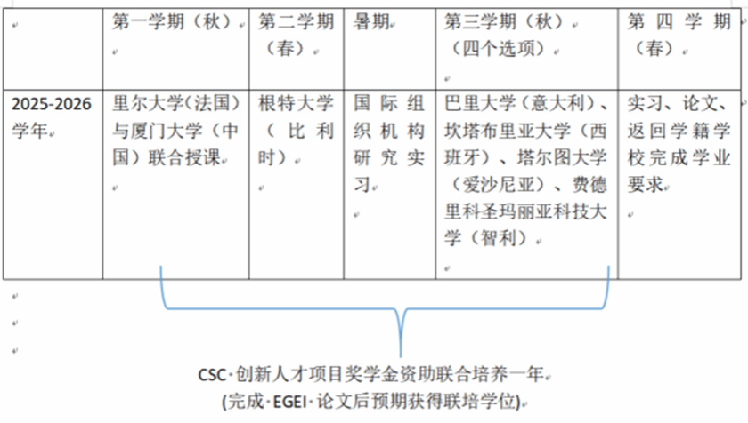 为培养和储备国际化复合型高端人才,更好地传播中国声音,参与国际组织事务,提升中国在国际上的话语权与合作共赢空间,在中国留学基金委员会(CSC)提供的奖学金资助(主要包括一次往返国际旅费和资助期限内的生活费)支持下,厦门大学经济学科将为研究生提供参与经济全球化与欧盟一体化(EGEI)欧盟联合硕士培养的机会。