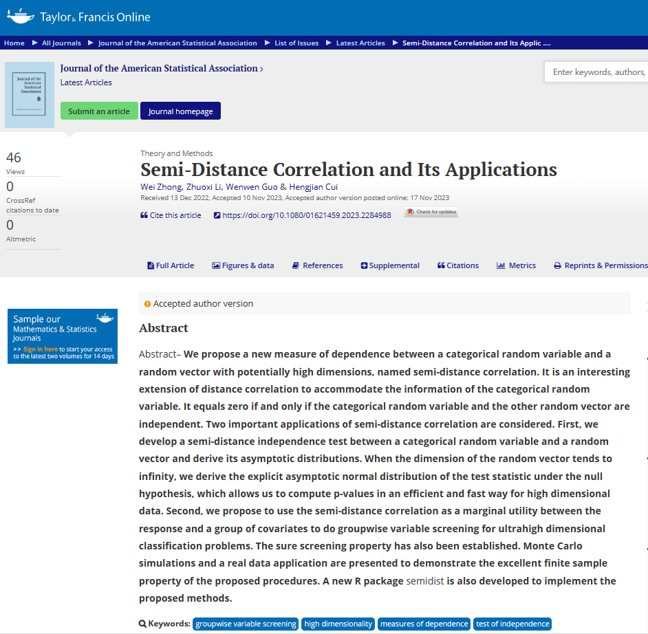 近日,由WISE、经济学院统计学与数据科学系钟威教授,与经济学院统计学与数据科学系2021级博士生李卓熹,首都师范大学崔恒建教授、郭文雯副教授合作完成的题为“Semi-Distance Correlation and Its Applications”的学术论文于统计学国际权威期刊Journal of the American Statistical Association在线发表。