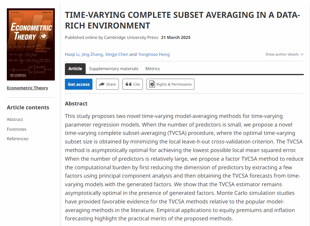 近日,厦门大学统计学博士后流动站博士后陈星伊与洪永淼教授、湖南大学李海奇教授、济南大学讲师张晶合作完成的学术论文“Time-varying complete subset averaging in a data-rich environment”在线发表于计量经济学国际权威期刊Econometric Theory,该刊是厦门大学经济学科认定的国际A类期刊。