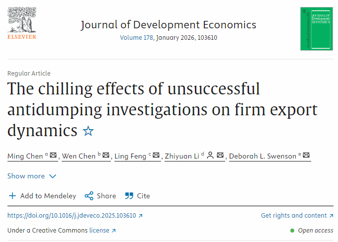 近日,经济学院国际经济与贸易系陈雯教授与上海对外经贸大学的陈鸣(厦门大学经济学院国际经济与贸易系2020届博士毕业生)、上海财经大学的冯玲、复旦大学的李志远、加利福尼亚大学戴维斯分校的Deborah L. Swenson合作撰写的论文“The chilling effects of unsuccessful antidumping investigations on firm export dynamics”,在发展经济学国际顶级期刊Journal of Development Economics正式发表,该刊也是厦大经济学科认定的国际A类期刊。