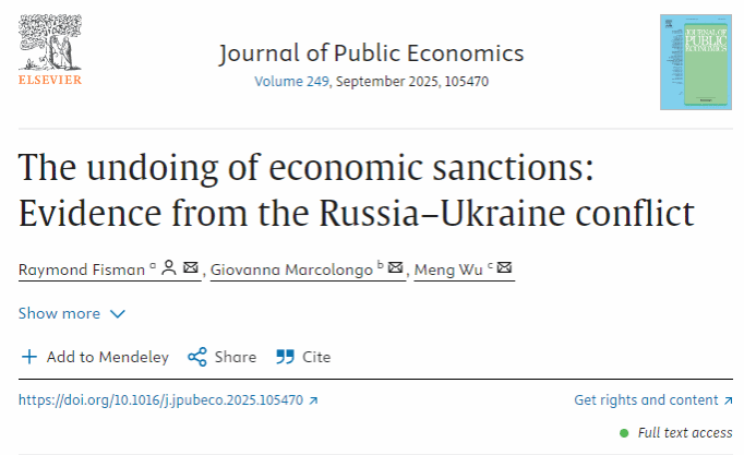 近日,王亚南经济研究院、经济学院经济学系助理教授吴朦与与美国波士顿大学Raymond Fisman、意大利博科尼大学BAFFI金融研究中心Giovanna Marcolongo合作撰写的论文“The undoing of economic sanctions: Evidence from the Russia–Ukraine conflict”,在国际公共经济学领域顶级期刊Journal of Public Economics正式发表,该刊也是厦大经济学科认定的国际A类期刊。