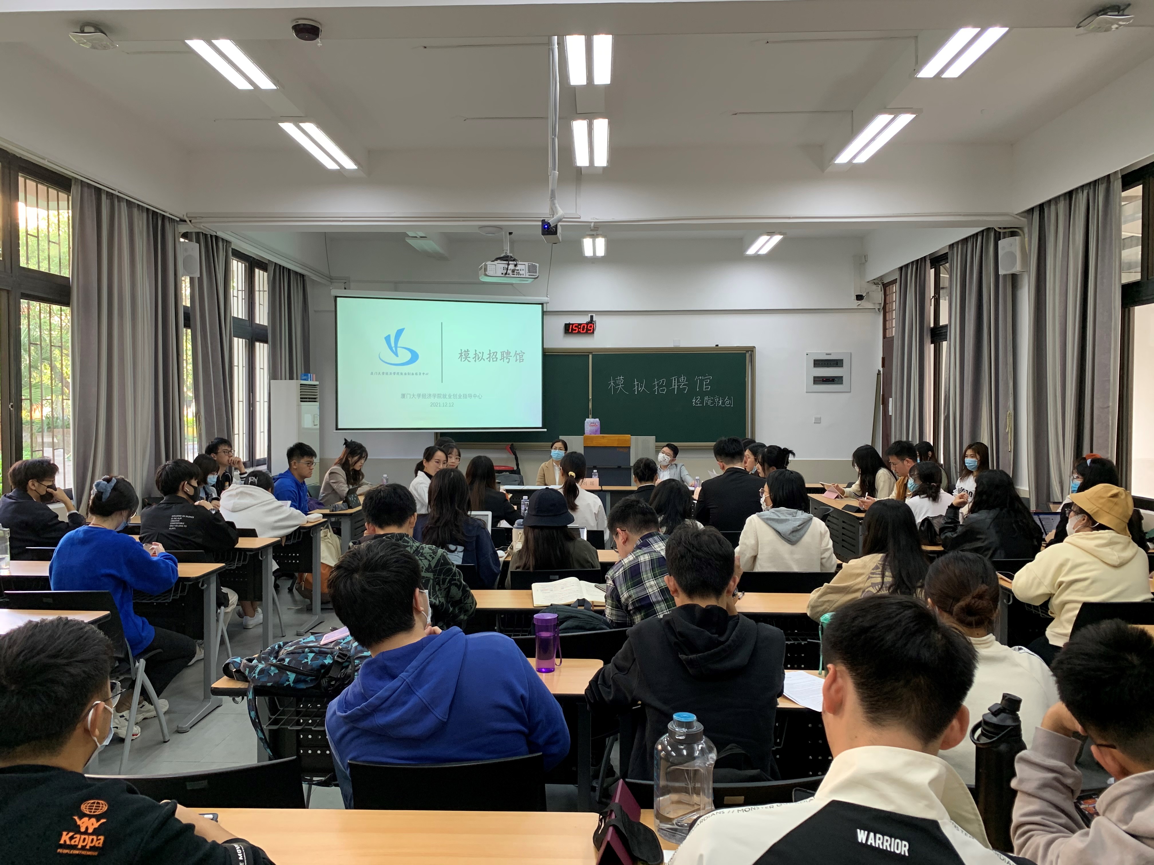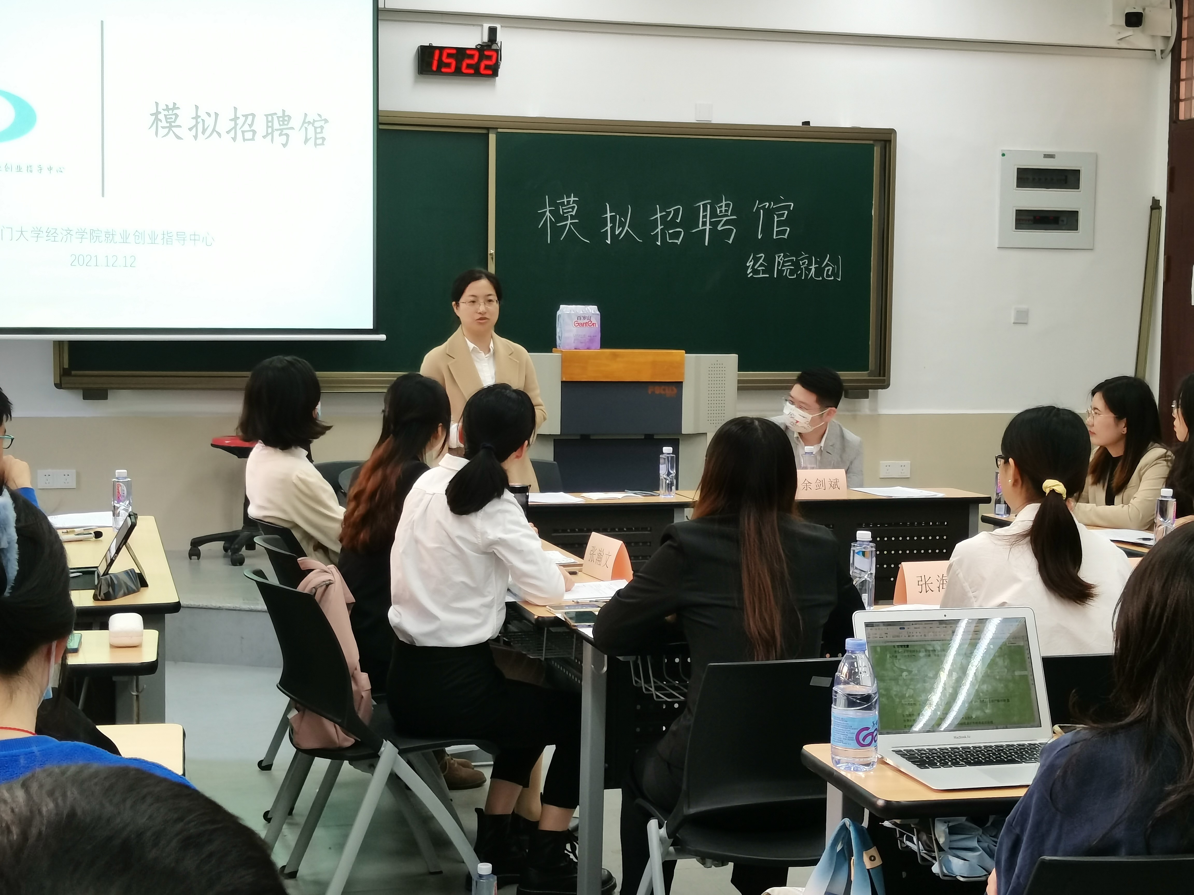 2021年12月12日,由经济学院就业创业指导中心与研究生部联合举办的“求职三部曲”之模拟招聘馆活动在南强二教学楼108圆满进行。本次活动为参与的同学们提供全真的模拟面试场景,旨在让同学切身感受面试过程,培养与提高在校大学生的求职面试能力,同时与企业进行合作、构建招聘平台,向企业输送优秀实习生以及有就业意向的应届毕业生。本次活动邀请到了德勤审计及鉴证经理刘瑶以及中信证券股份有限公司厦门鹭江道证券营业部副总经理余剑斌两位嘉宾莅临指导。