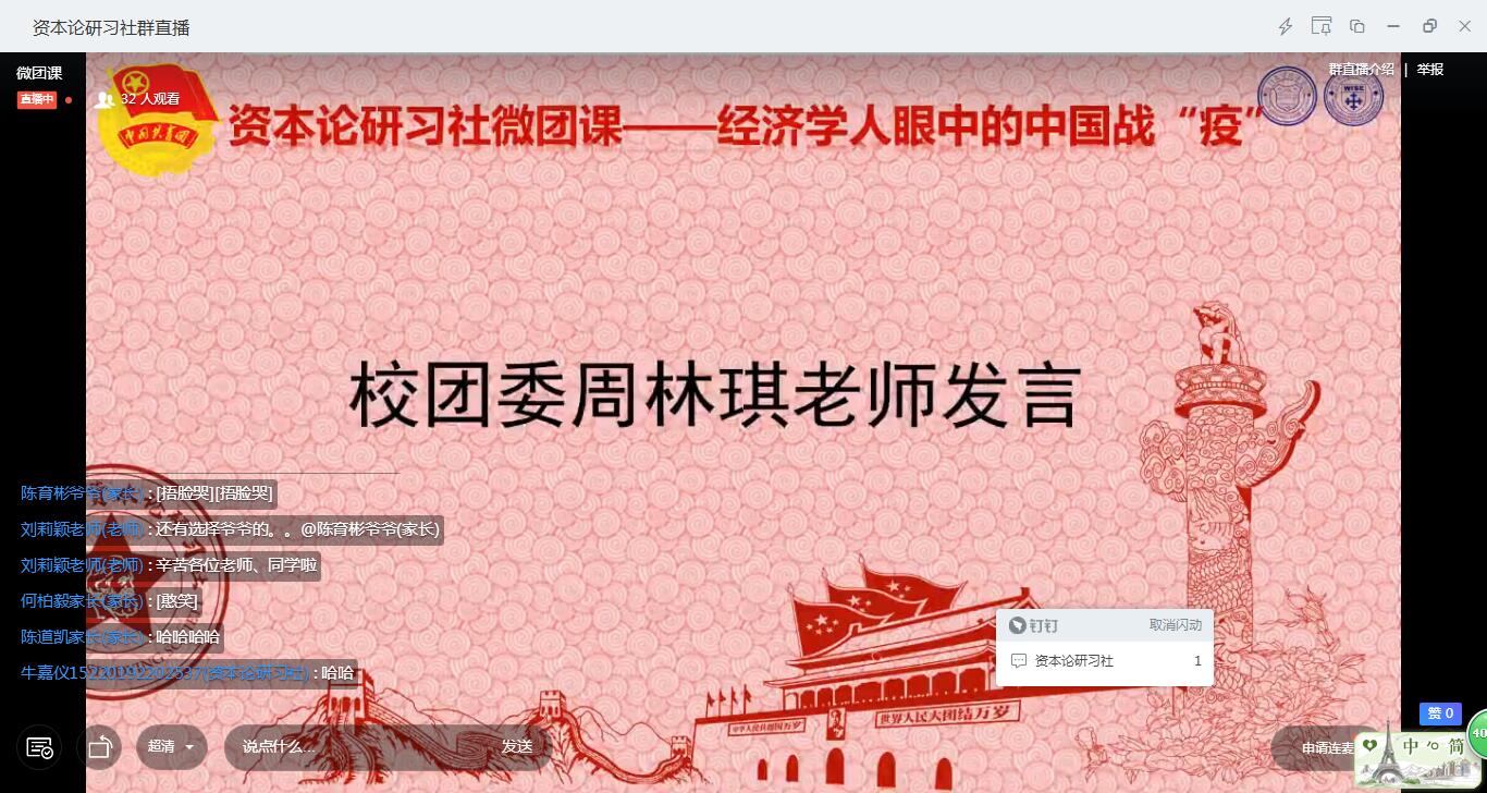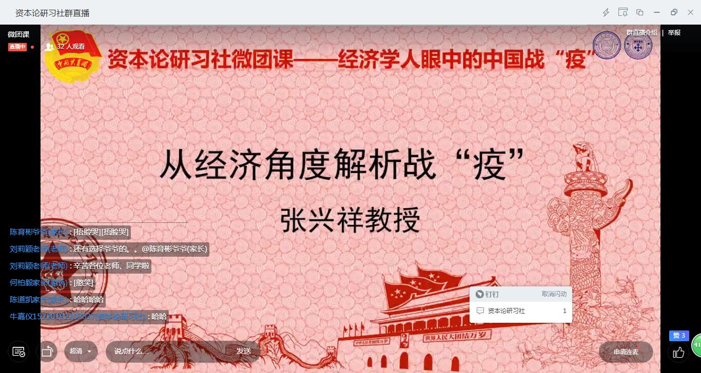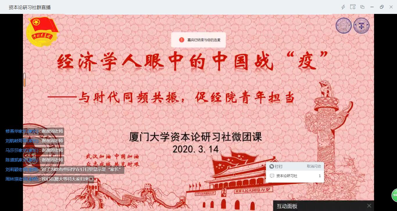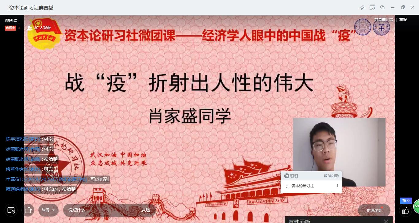 3月14日下午4时,厦门大学资本论研习社开展了以抗击新冠肺炎疫情为背景的“经济学人眼中的中国战‘疫’”线上主题微团课,让社团成员明晰身为经济学人在时代挑战前应具有的思考和担当。微团课由社团团支书牛嘉仪主持,社团指导老师张兴祥、刘莉颖、徐惠聪及全体社团团员参加,校团委副书记周林琪全程指导与点评。