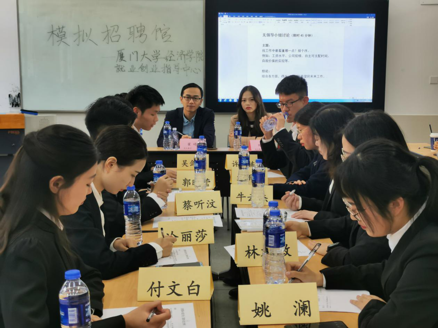 2019年12月15日下午三时,由厦门大学经济学院就业创业指导中心举办的“求职三部曲”之“模拟招聘馆“活动在南强教学楼102成功举办。本次活动邀请到了中信证券股份有限公司厦门鹭江道证券营业部的副总经理余剑斌先生、中国光大银行厦门分行人力资源管理中心主任翟靖先生、中国光大银行厦门分行财务经理刘蓉兰女士三位嘉宾。三位嘉宾亲自主持群体面试无领导小组讨论以及单人面试,并进行了面试技巧的精彩分享。