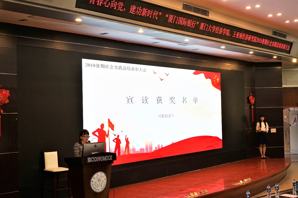 12月16日下午,厦门大学经济学院、王亚南经济研究院2019年“青春心向党,建功新时代”暑期社会实践活动总结表彰大会在经济学院N402顺利召开。经济学院党委书记黄鸿德,闽都中小银行教育发展基金会副秘书长张莹,院党委副书记周蕾,院团委书记刘莉颖,本次暑期实践优秀带队老师,辅导员和优秀实践团队代表等出席本次大会。