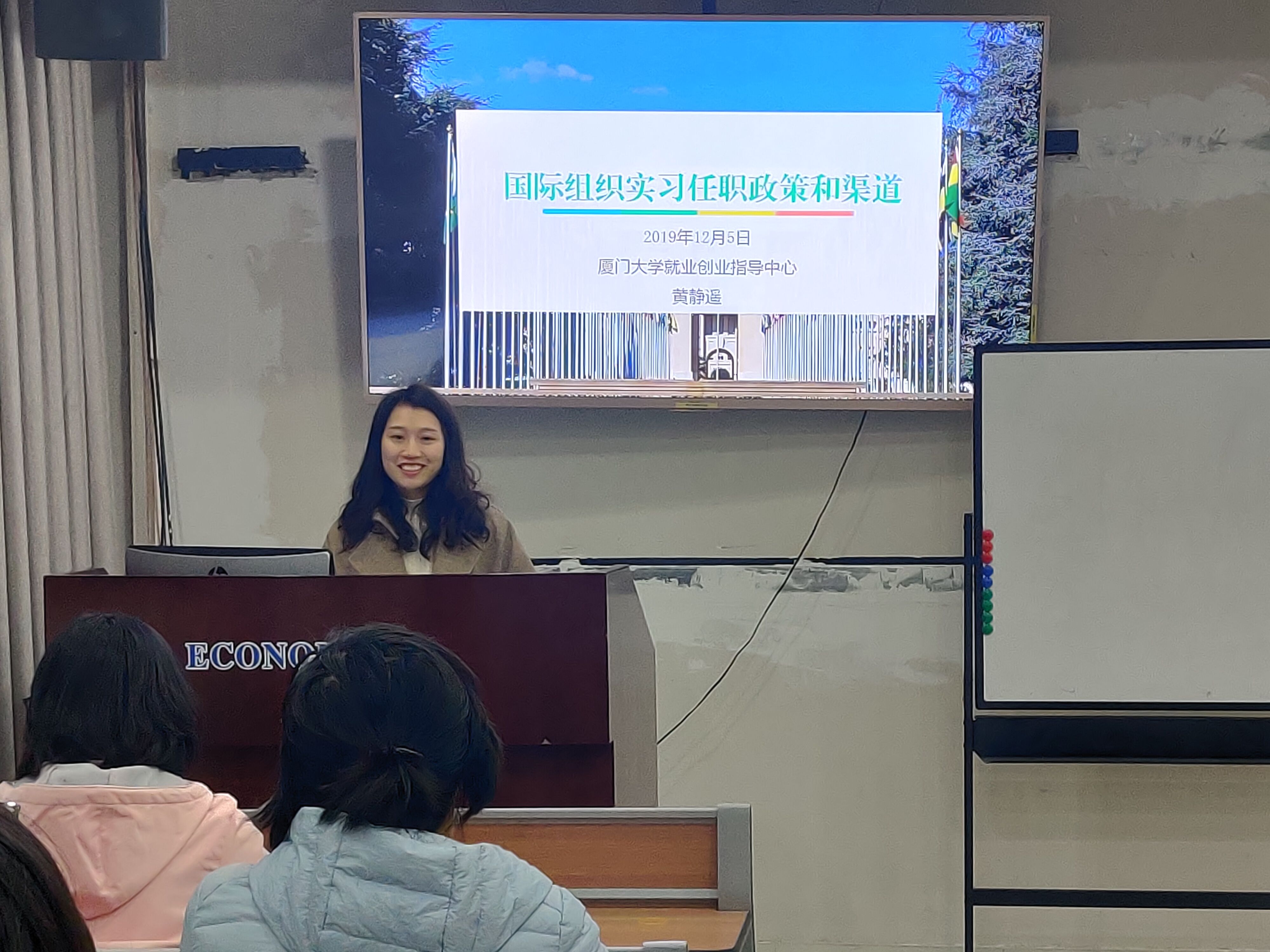 为普及国际组织知识,鼓励和引导更多的厦大学子走上国际舞台、参与国际事务,12月5日晚,经济学院就业创业指导中心邀请了厦门大学学生处就业创业指导中心黄静遥老师及拥有巴黎国际大学联盟实习经验的2015级博士生李慧为经济学院的学生们展开了一场精彩的分享会。