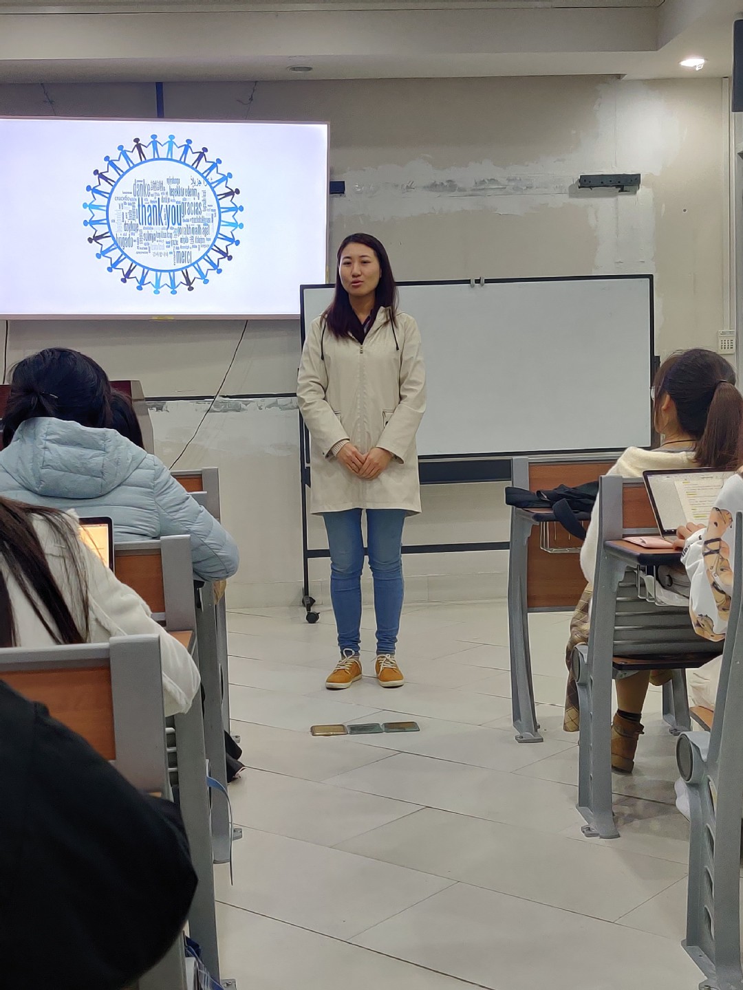 李慧学姐则以独特而亲切的方式向同学们娓娓道来自身真实经历。她讲述自己从国际组织报名到工作一路历程中的种种难关及挑战,如在法国语言不通,文化习俗不同带给她的困扰以及对于当地饮食风格的独特体验,丰富了同学们的见闻,活跃了现场的气氛。同时她希望同学们能够具备学习的主动性,培养工作能力及社交能力。从她在巴黎生活的酸甜苦辣中,同学们也切身感受到国际组织工作的苦与乐,对于国际组织工作生活有了更加深入具体的了解。