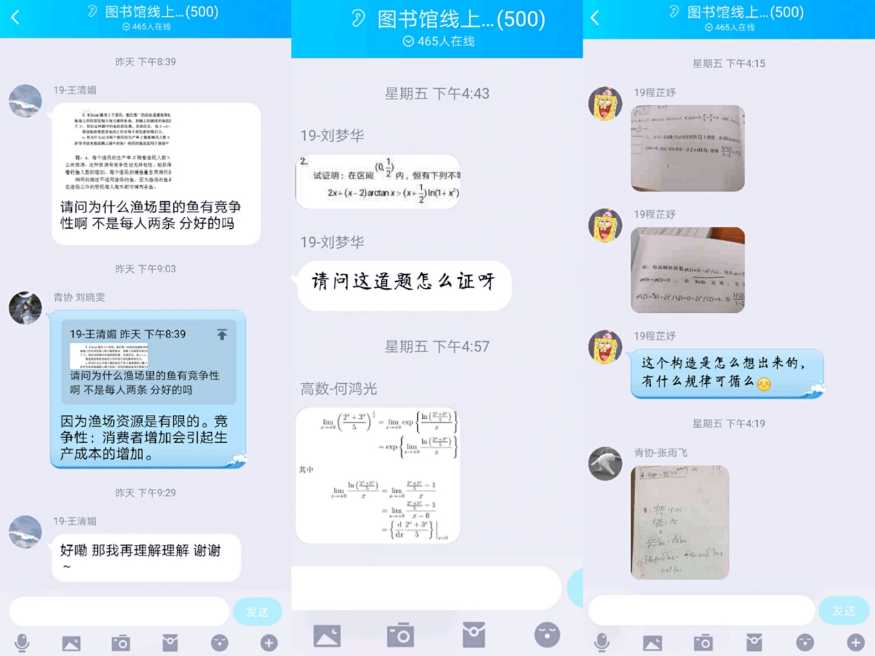 而在无人前来咨询时,答疑志愿者们也不会让自己空闲,他们会在经院官方图书馆答疑群中为因有事不能前来的同学进行线上答疑,针对每位同学的问题作出回答并将详细过程写在纸上发在群里,线上答疑并无固定时间,即使不是周五晚,答疑群中也会有志愿者为大家解决困难。 本志愿服务活动本着提高同学们学习生活质量的初心,旨在为大一新生解决难度较大的高等数学及经济学方面的疑问和困惑,帮助同学们更快的适应大学学习生活,巩固自己的专业知识,找到适合自己的学习方法,并且为之后的四年打下坚实的基础。经济学院青年志愿者协会图书馆答疑活动正像是大学生活里的一盏明灯,让迷茫中的人看到方向,青年志愿者协会将继续保持初心,为同学们服务!