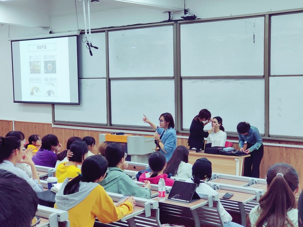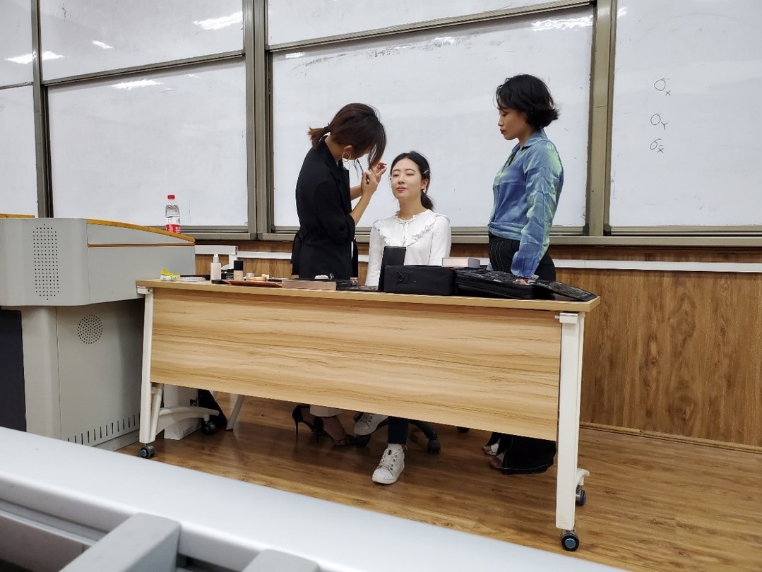 进入到“职业妆容技巧指导”环节时,芯瑶老师首先以其担任化妆造型指导的电视剧《创业时代》中男女主角的造型变化来展现不同造型带来的风格差异,使同学们认识到了职场造型的重要性。接着她又用图表数据的形式说明了简历照片带给面试官的印象在求职过程中是至关重要的,这不仅激发了在场同学的好奇心,而且提升了参与活动的积极性。