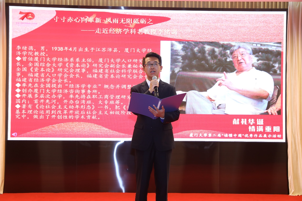 为深入贯彻落实全国教育大会精神,创新大学生思想政治教育形式和内容,厦门大学于2019年3月至6月举办第二届“读懂中国”活动,并于10月24日举办主题为“献礼华诞 情满重阳”的成果汇报活动,对本次活动的优秀作品进行展示。经济学院共有三件作品获奖,其中两件参与优秀作品展播,学院还荣获优秀组织奖。