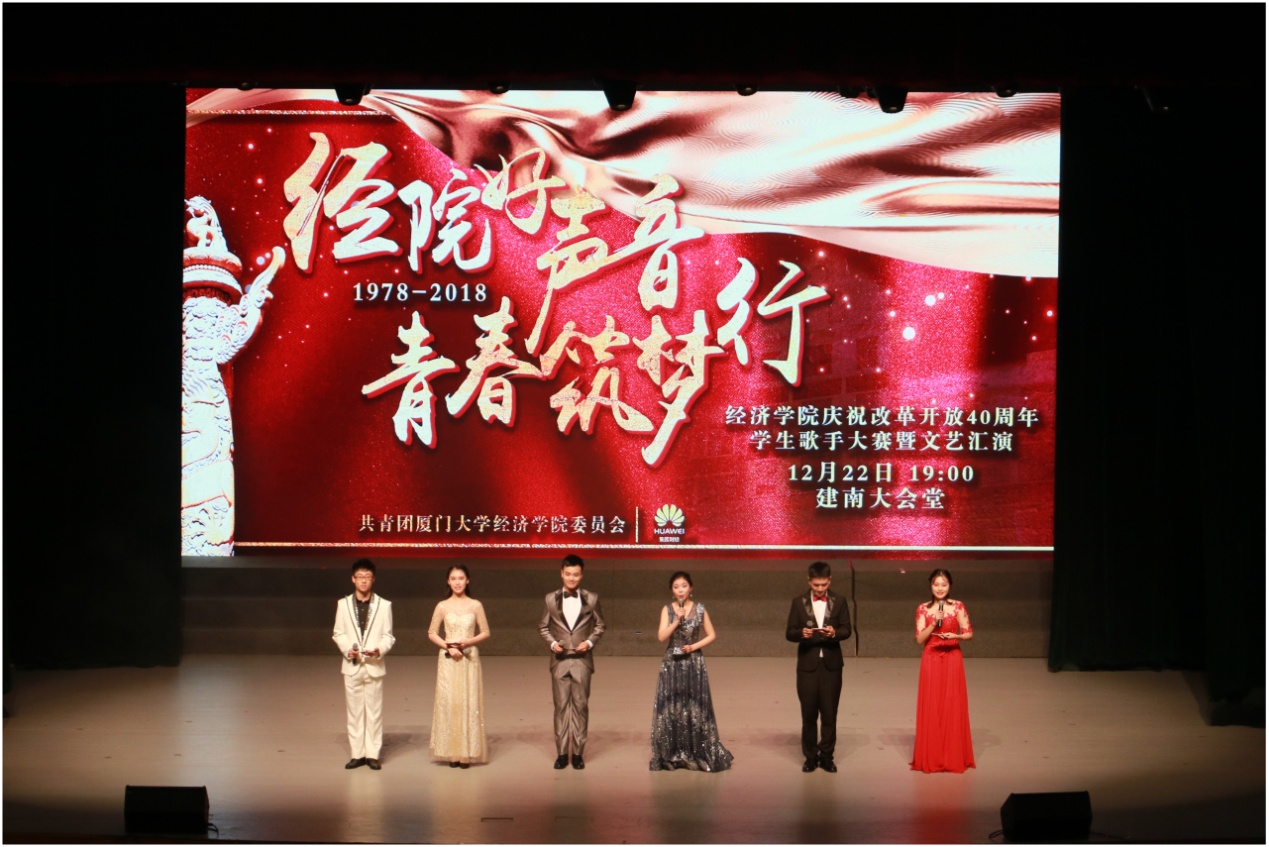 “经院好声音”除了是歌手竞唱角逐的舞台,也是经院学生舞蹈、合唱、主持、啦啦操等学生文艺团队的展示平台。作为经院的品牌活动,“经院好声音”自2012年至今已举办七年,是经济学院培养全面发展人才、打造文化育人的重要途径。改革开放四十年筚路蓝缕,风雨兼程,祖国摆脱贫弱,正以全新的姿态傲立在新时代的路口。歌声激昂,在厦门大学“双一流”的建设进程中,在实现中华民族伟大复兴的征程中,经院人将不忘初心、牢记使命,不负时代重任,奋力做出新的更大贡献。