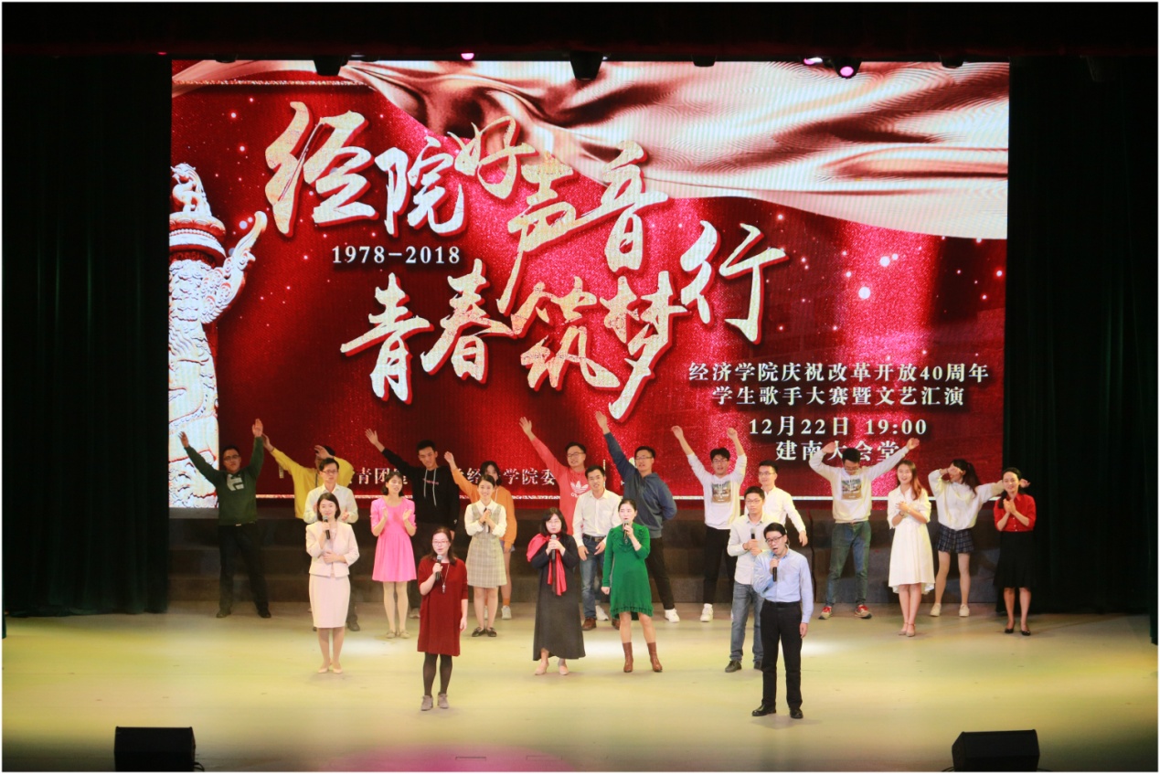 歌手赛暨文艺汇演精彩纷呈,高潮不断,展现了经院师生良好的精神面貌。“经院好声音”除了有歌手的角逐,也作为经院学生舞蹈、合唱、主持、啦啦操等学生文艺才华的展示平台。作为经院的品牌活动,“经院好声音”自2012年至今已举办七年,是经济学院培养全面发展人才、打造文化育人的重要途径。改革开放四十年筚路蓝缕,风雨兼程,祖国摆脱贫弱,正以全新的姿态傲立在新时代的路口。歌声激昂,在厦门大学“双一流”的建设进程中,在实现中华民族伟大复兴的征程中,经院人将不忘初心、牢记使命,不负时代重任,奋力做出新的更大贡献。