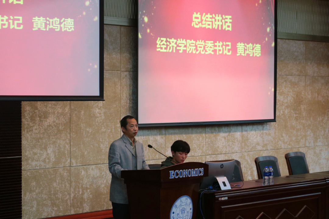 学院党委书记黄鸿德进行总结讲话。黄鸿德对厦门国际银行的赞助支持表示衷心感谢,对获奖师生表示热烈祝贺,并感谢参与指导暑期实践的全体老师。黄鸿德指出,经济学科暑期社会实践活动经历十几年的发展,已逐渐走向成熟,在推动了同学们走进基层调查国情民情,服务经济社会发展,强化了同学们对中国特色社会主义事业的认同感和主人翁精神,为实现中华民族伟大复兴的中国梦凝聚青年力量。并提出要将社会实践与理想信念教育、党情国情教育、创新创业教育和专业知识教育相融合,在实践中帮助学生牢固树立“四个正确认识”,在实践中教育引导学生将激昂的青春梦融入伟大的中国梦,在实践中培养坚持以马克思主义为指导、扎根中国大地的经济研究人员;要整合校内校外资源,打造更多厦大经济学科的品牌实践项目。