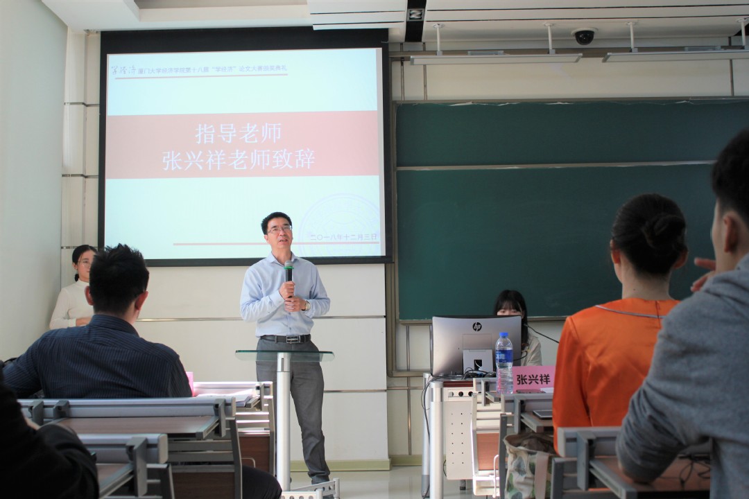 12月3日中午,厦门大学经济学院第十八届“学经济”论文大赛颁奖典礼在经济学院D136顺利举行。本次大赛由厦门大学经济学院、厦门大学国家经济学人才培养基地主办,厦门大学经济学院习近平新时代中国特色社会主义思想读书社、厦门大学马克思主义政治经济学学习社、厦门大学《资本论》研习社承办。经济学院党委书记黄鸿德、经济学院党委副书记周蕾、经济学系教工党支部书记张兴祥、经济学系副主任赵建、《学经济》主编李嘉楠、辅导员徐惠聪、刘长青出席了颁奖典礼。
