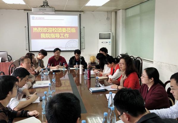 11月27日上午,厦门大学校团委副书记(主持工作)洪海松、校团委秘书周林琪、校团委姚东明、王岩芳、兼职辅导员洪佳敏一行来我院就共青团工作进行调研。经济学院党委副书记周蕾,院团委书记何丽苹、郑淑真、陈启妍,辅导员和青年团员代表参加了调研座谈会。