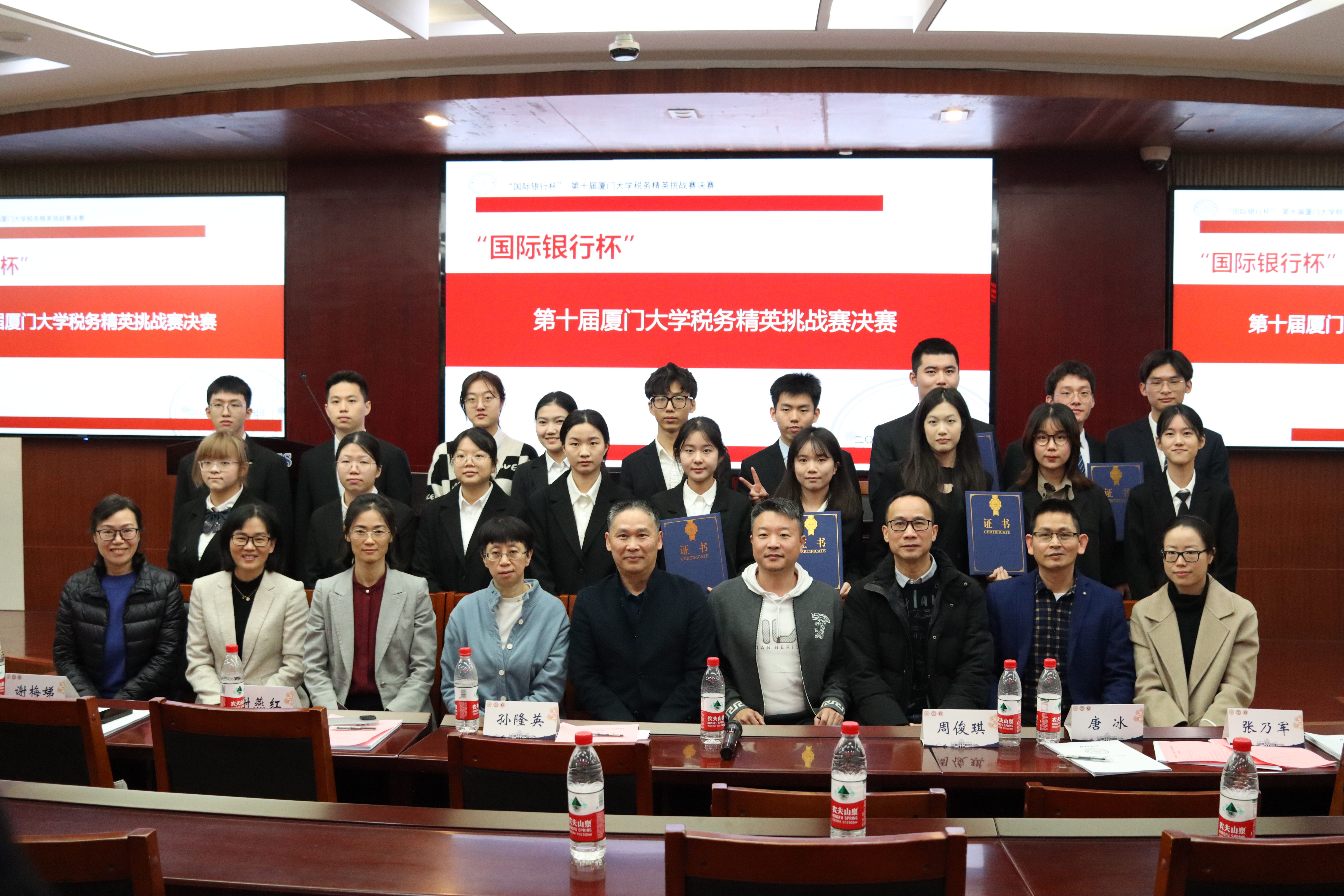 12月17日,第十届“国际银行杯”厦门大学税务精英挑战赛决赛在经济楼N203会议室举行。国家税务总局厦门火炬高技术产业开发区税务局二级高级主办周俊琪,厦门市税务局国际税务管理处二级调研员孙隆英,普华永道(厦门)高级经理唐冰,毕马威企业咨询(中国)有限公司厦门分公司税务经理谢燕红,美亚柏科高级副总经理、财务总监张乃军,厦门朴世财税咨询有限公司总经理谢梅娣担任决赛评委。厦门大学经济学院财政系系副主任林细细,财政系教师熊巍、周竺竺,辅导员和学生代表参加活动。
