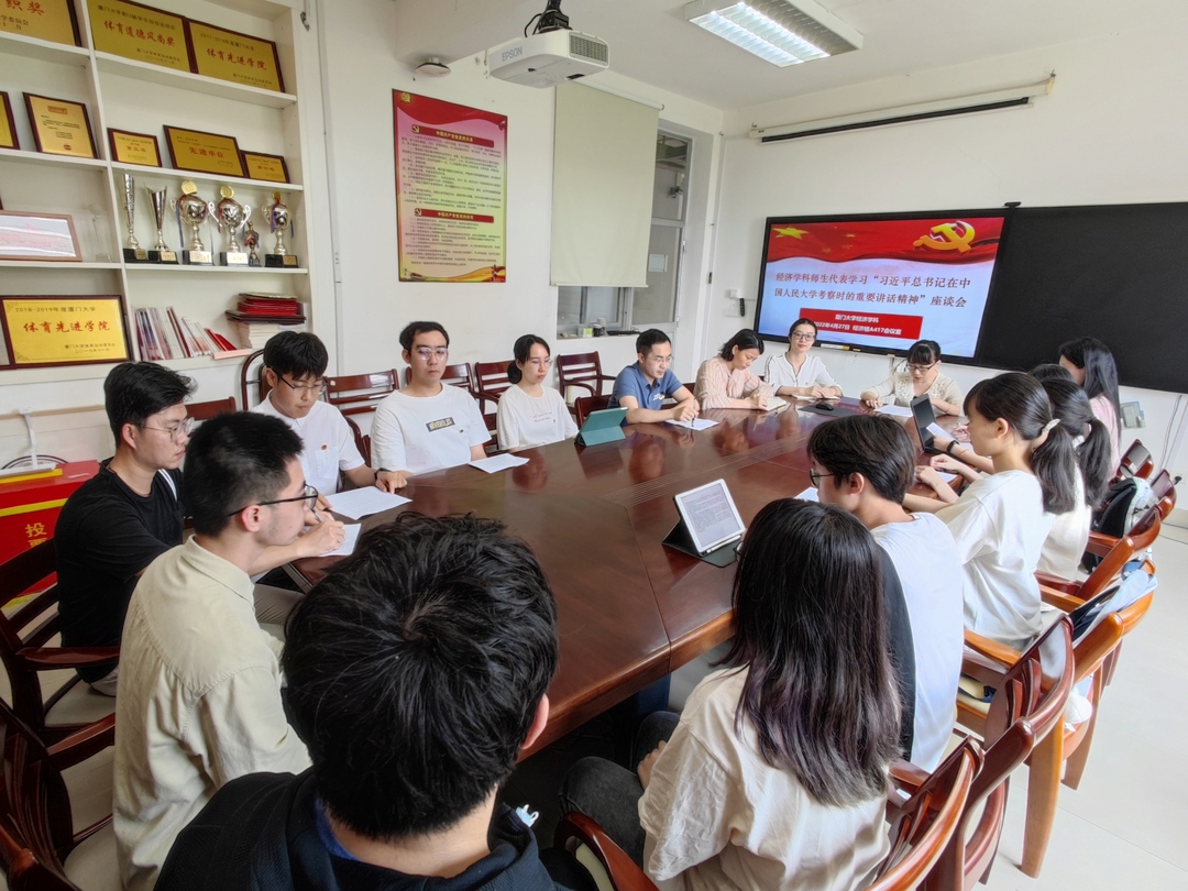 4月25日,在五四青年节即将到来之际,习近平总书记到中国人民大学考察调研,向全国各族青年致以节日的祝贺,勉励全国广大青年牢记党的教诲,立志民族复兴,不负韶华,不负时代,不负人民,在青春的赛道上奋力奔跑,跑出当代青年的最好成绩!4月27日,厦门大学经济学科在经济楼A417会议室召开学习习近平总书记在中国人民大学考察时的重要讲话精神座谈会。学院团干、辅导员和团员、党员代表参加学习。参会师生们一致表示今年将召开党的二十大,厦大经济学科也正迈向新百年新阶段,在新的历史征程中,要牢记习近平总书记的嘱托,责任在肩,砥砺前行,彰显中国青年的使命担当。座谈会由学院团委副书记赵小姝老师主持。