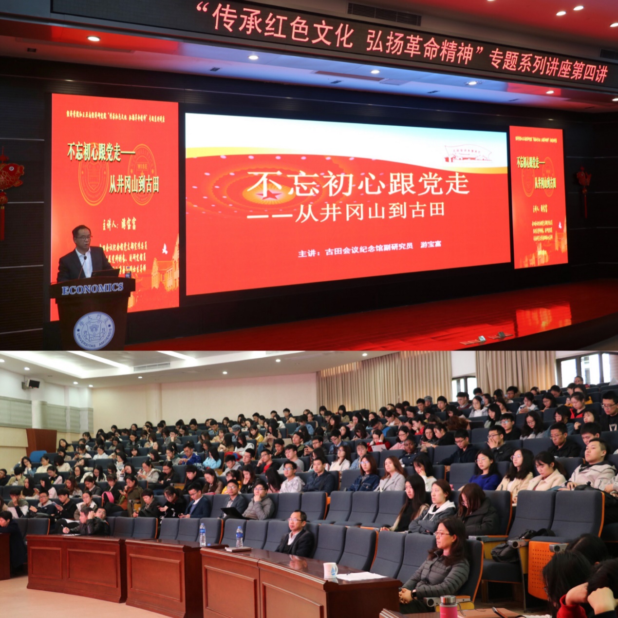 值此古田会议召开九十周年、中华人民共和国成立七十周年之际,经济学院举办“传承红色文化 弘扬革命精神”专题系列讲座,激励全体师生不忘初心、牢记使命,传承弘扬起光荣的“红色血脉”,向着更高远的理想目标砥砺奋进。