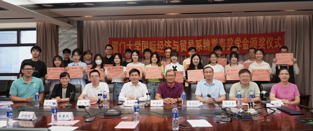 6月19日下午,经济学院国际经济与贸易系第十六届“魏嵩寿奖学金”颁奖仪式在经济楼N501会议室隆重举行。魏嵩寿奖学金基金会理事会副理事长、经济学院党委副书记杜海林,魏嵩寿奖学金基金会理事会副理事长、经济学院副院长彭水军,国贸系副主任(主持工作)蒋冠宏、副主任杨曦,国贸系武力超、张少军、陈小鸿等老师及获奖学生出席本次仪式。颁奖仪式由辅导员钟民栋主持。