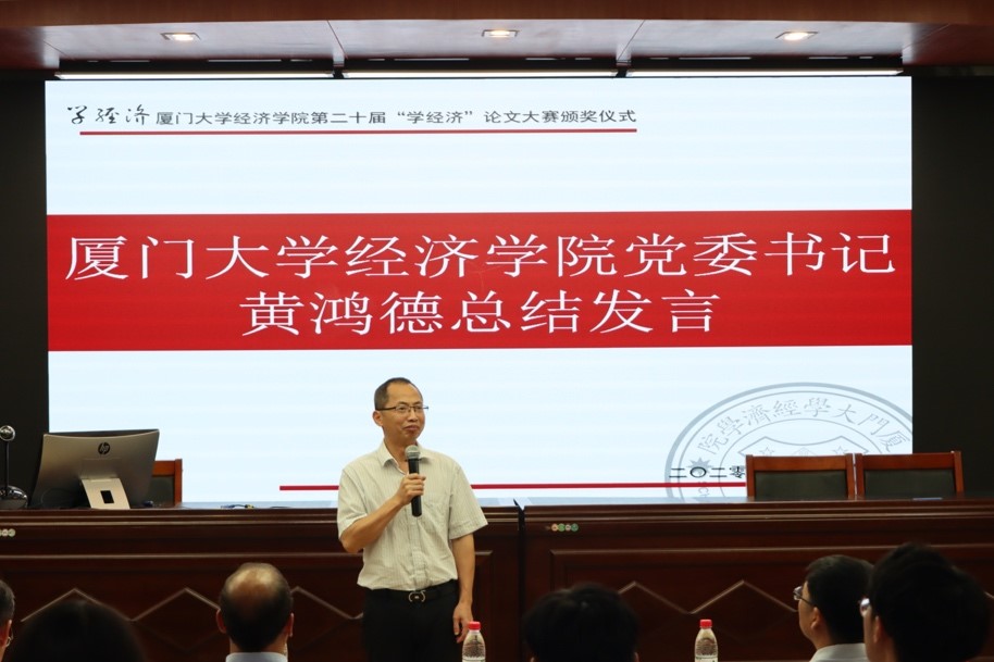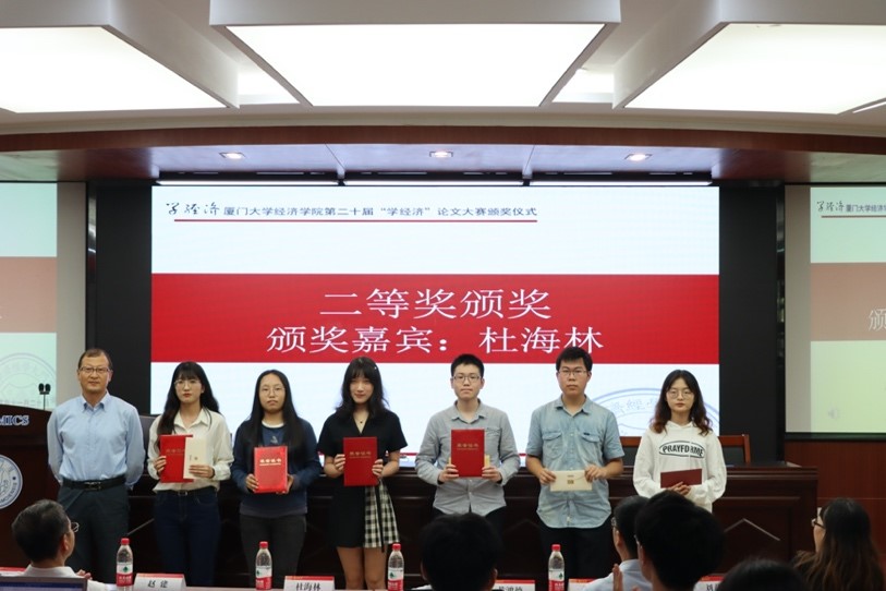 11月20日中午,厦门大学第二十届“学经济”论文大赛颁奖仪式在经济学院N302顺利举行。本次大赛由厦门大学经济学院、厦门大学国家经济学基础人才培养基地主办,厦门大学经济学院习近平新时代中国特色社会主义思想读书社、厦门大学马克思主义政治经济学学习社、厦门大学《资本论》研习社承办。本次颁奖仪式由《学经济》编辑部执行主编黄晓萍同学主持。参加仪式的嘉宾有:经济学院党委书记黄鸿德、经济学院党委副书记杜海林、经济学系代系主任,经济学系党支部书记张兴祥、经济学系副主任赵建、经济学系助理教授杨子砚、经济学院助理教授李嘉楠、经济学院团委书记刘莉颖、辅导员徐惠聪、刘长青。
