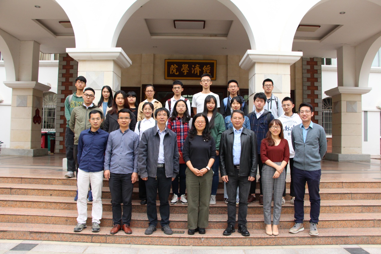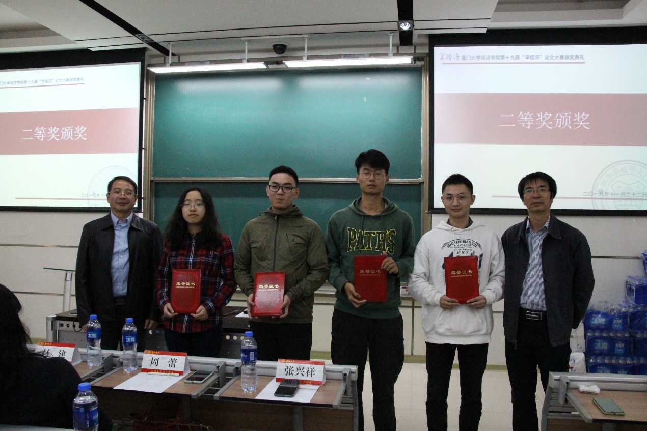11月22日中午,厦门大学经济学院第十九届“学经济”论文大赛颁奖典礼在经济学院D136顺利举行。本次大赛由厦门大学经济学院、厦门大学国家经济学人才培养基地主办,厦门大学经济学院习近平新时代中国特色社会主义思想读书社、厦门大学马克思主义政治经济学学习社、厦门大学《资本论》研习社承办。经济学院党委副书记周蕾、经济系教工党支部书记张兴祥、经济学院团委书记刘莉颖、经济系副主任赵建、《学经济》主编李嘉楠、辅导员徐惠聪、刘长青出席了颁奖典礼。