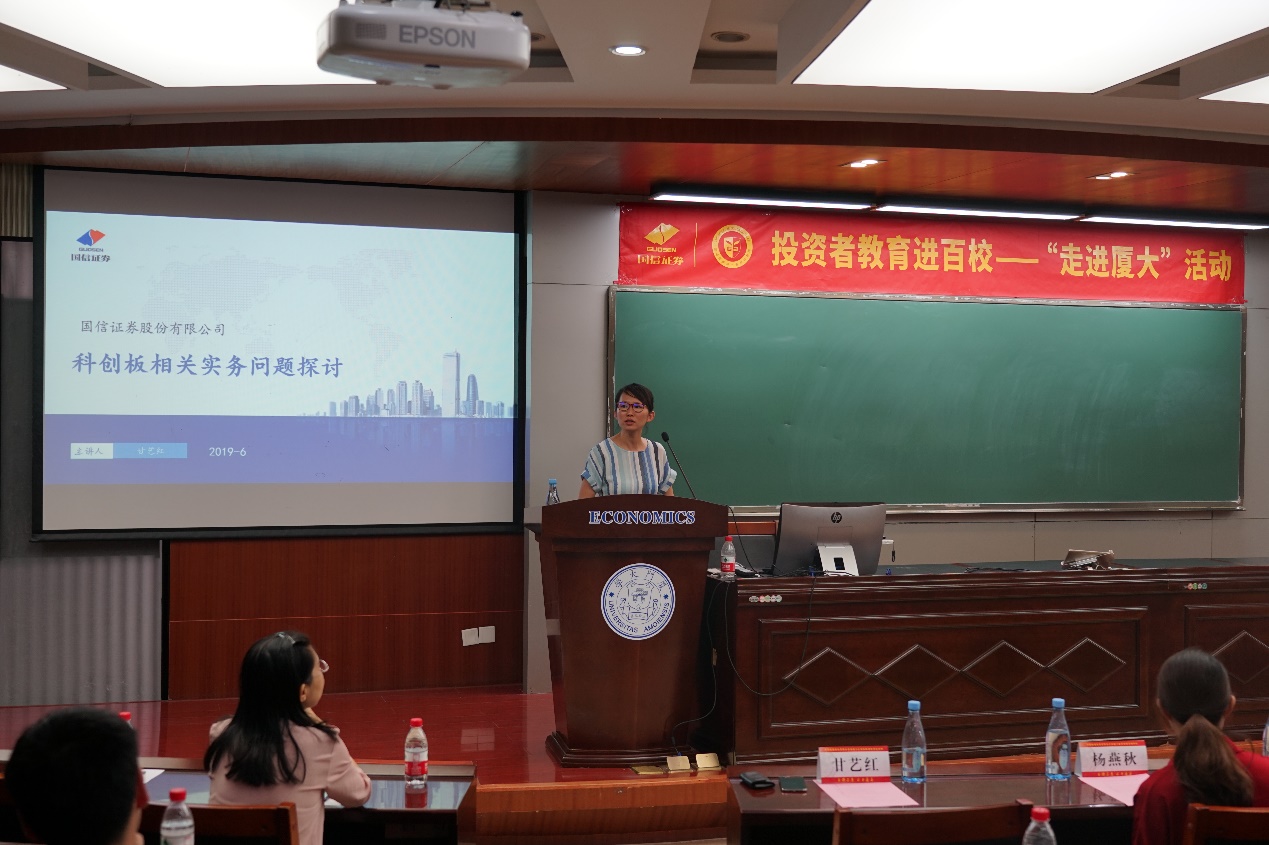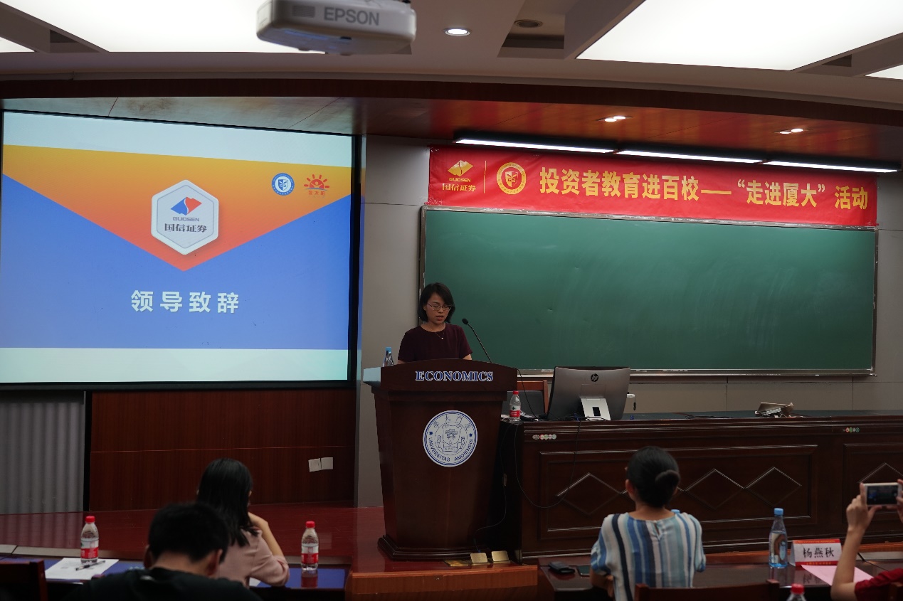 6月23日下午,“投资者教育进百校”厦门大学专题讲座在经济学院顺利举行。厦门证监局信息调研处副处长朱玲、经济学院党委副书记周蕾、厦门证券期货基金协会综合部主任陈静、国信证券股份有限公司福建分公司总经理陈茹娟等出席了本次活动。活动由厦门市证监局支持指导,厦门证券期货基金业协会、共青团厦门大学经济学院委员会主办,国信证券福建地区投资者教育基地承办。