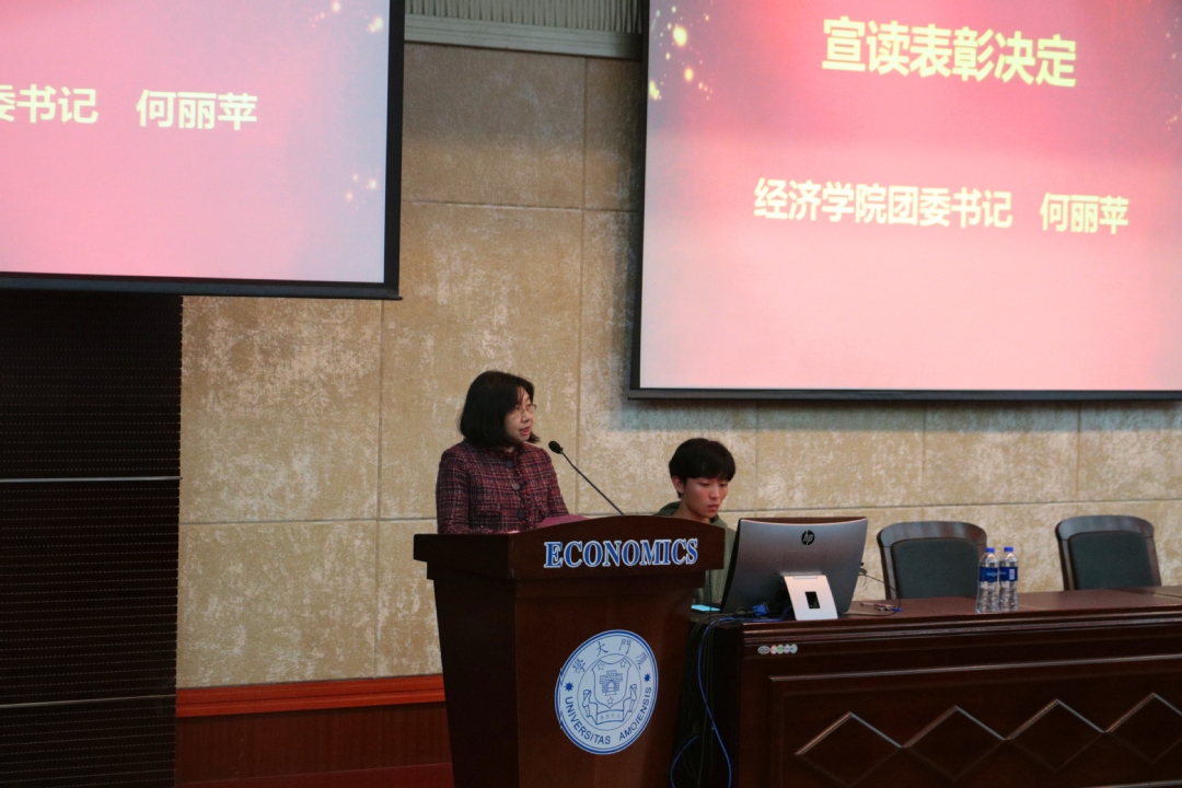经济学院本科生团总支实践中心主任吴琼同学从活动组织、参与人数、活动特色和实践成果等方面介绍了今年暑期社会实践的基本情况。经济学院团委书记何丽苹宣读表彰决定,蔡晶晶副教授等20人被评为暑期实践优秀指导老师,“无人问经”实践队等20个团队获评优秀团队。与会嘉宾为获奖师生颁发了荣誉证书并合影留念。