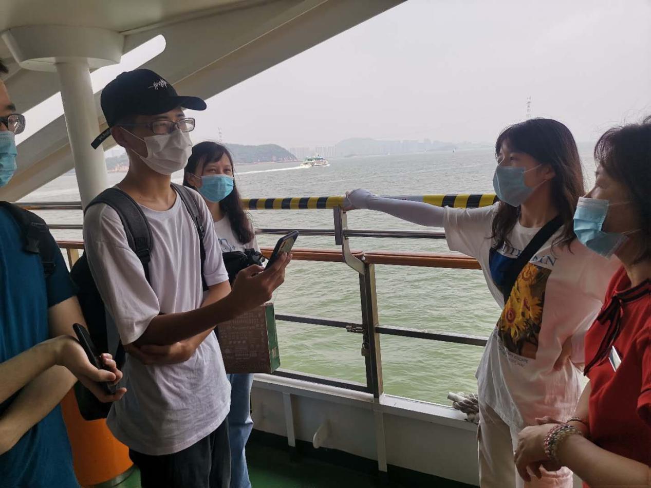 登船后,队员们借机采访轮渡工作人员以了解疫情前后的航线客运量。工作人员表示,每艘船核载600人,每日上岛人数上限为5万人。往年暑假期间每日接待游客会达到最大客运量,且仍有不少游客买不到票。如今虽然疫情减缓,政策放开,但客运量仍达不到同时期客运量的一半,每日上岛人数也仅在3万人左右。