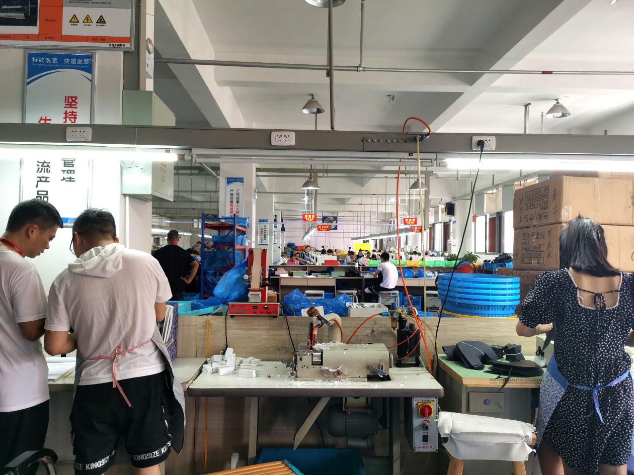 来到车间,映入眼帘的是忙碌而有序的景象。偌大的车间按照制鞋流程被分为不同的组别,员工们熟练操作各种机器,效率很高。负责人时不时会拿着喇叭向员工强调一些制鞋的要点,以保证产品的质量。