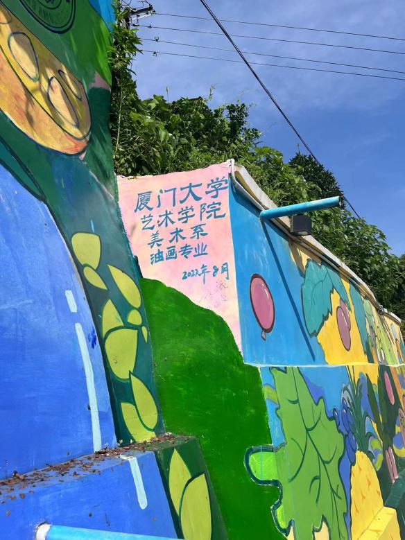 近年,厦门大学艺术学院“艺起乡建”暑期社会实践队到福建南平光泽县鸾凤乡十里铺村,将文艺演出和音乐教育送下乡,实践队员以“鸾凤十里瓜果飘香”为主题创作墙绘。习近平总书记曾指出,美术教育是美育的重要组成部分,对塑造美好心灵具有重要作用。时间队员们用手中画笔描绘美丽乡村,用美育感染乡村群众,用艺术助力乡村振兴,用青春力量践行青年使命。