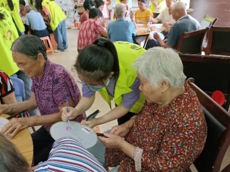 实践队队员在采访了负责人之后,便参与到了幸福院的志愿活动中。幸福院开设了教老人绘画的课程,用水彩在扇子上画出几束花。在绘画过程中,志愿者纷纷协助老人进行绘画,挑选颜色,提出建议。队员们还与老人一同参与套圈小游戏,帮忙记录,及时补货。最后,实践队队员们还志愿为老人们进行文艺表演,诗词朗诵和红歌演唱都赢得了老人们的热烈掌声。在场的老人们兴致都很高昂,坐成一圈与我们齐声合唱《我的祖国》,响亮的歌声回荡在幸福院中。实践队队员与老人们热情交流,打成一片,收到了老人们的一致赞扬。