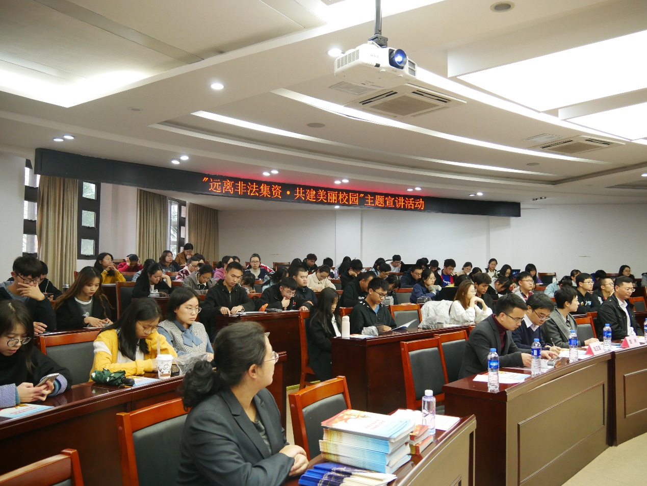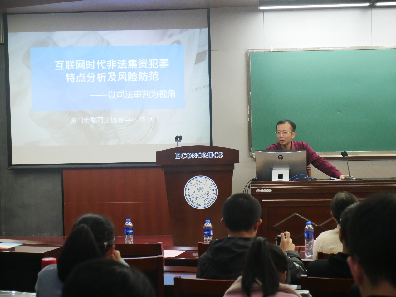 12月6日下午,“远离非法集资·共建美丽校园”主题宣讲活动在经济学院N302顺利举行。活动旨在更好地普及金融知识,引导大学生树立科学、正确的消费观,增强金融风险防范意识,配合开展打击非法集资犯罪及扫黑除恶专项斗争工作。厦门市地方金融监督管理局金融协调处处长李铭、思明区人民法院金融法庭副庭长林鸿、厦门市地方金融协会秘书长詹琳、经济学院金融系副教授赵正堂出席了本次活动。