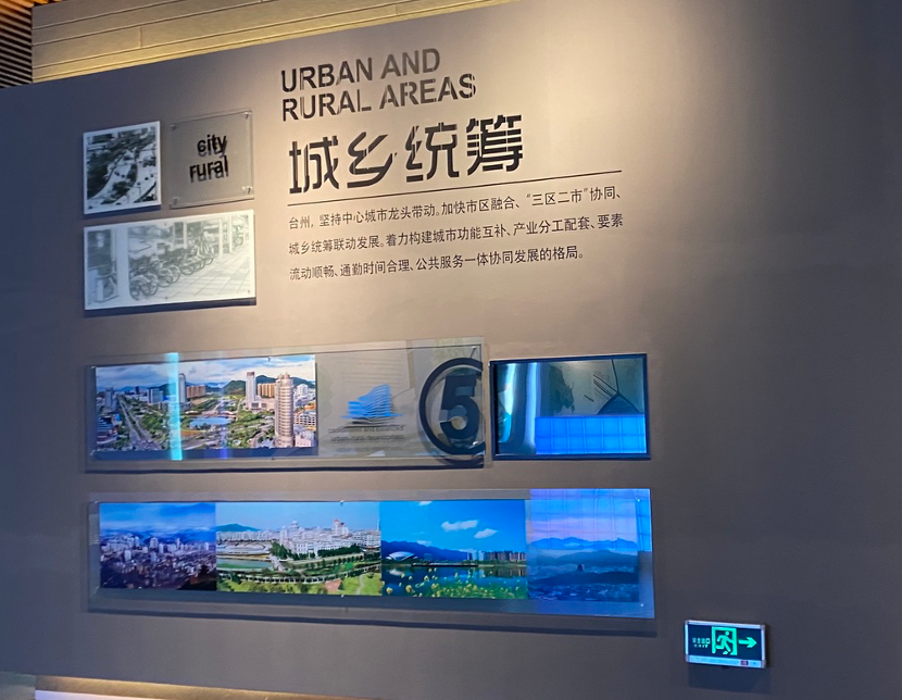 随后,在“见证发展”展馆,简单的文字叙述下是一段激昂的历史旋律。1994年台州撤地建市,迈开了中心城市建设的激昂步伐,围绕“浙江沿海中部区域性中心城市”的战略定位,台州深化城市规划,完善城市功能,发展城市文化,营造人居环境。如针对台州城市特点,政府提出城乡融合战略,以统筹城乡发展为原则,以区域协调、差异互补、可持续发展为特征,走新型城市化道路,构建“一主一副五中心”的市域空间格局,提升主城区与沿海副中心的辐射带动力,着力培育小城市和中心镇。通过二十多年的努力,台州经济实力整体跃升,城乡面貌日新月异,中心城市建成区面积由1993年的27.9平方公里,扩大到2015年的140平方公里,大气疏朗的“环绿心组图式城市”拔地而起。