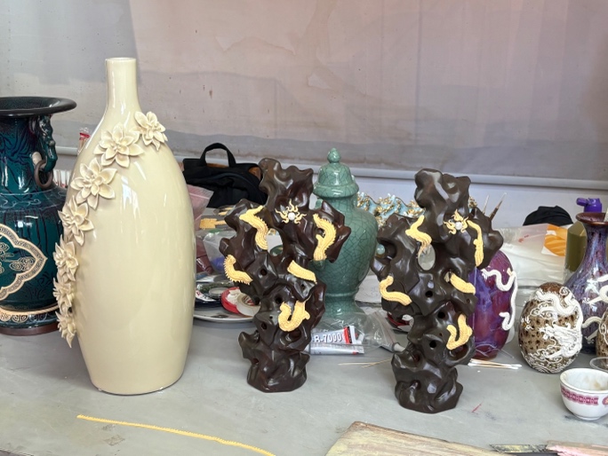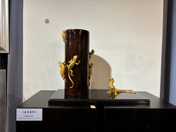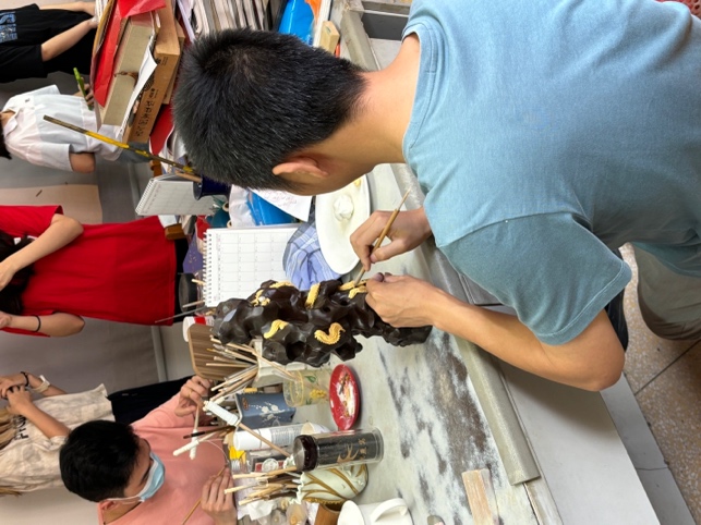 最后,实践队成员们来到了工作室,见到了漆线雕制作的整个过程。在这个充满艺术气息的空间里,四位工作人员正在紧张而有序地工作着。他们分别负责雕刻、粉底、漆线装饰和装金填彩等不同的工序,每一道工序都充满了匠心独运的创意和精湛的技艺。其中,一位师傅正在进行手搓线的工作,据说他能够搓出细如发丝的漆线;另一位师傅则正在用金箔填色,将24K金箔贴在已绕出纹样的漆线上;另外两位师傅则在进行漆线装饰的工作,以连绵不断的线紧密地盘绕出层次丰富、繁复精美的纹样。在光照下,这些作品呈现出极为立体的效果,让人叹为观止。这些作品不仅展现了传统意象的华美,更蕴含着匠人们世代传承的精湛技艺与深厚情感。