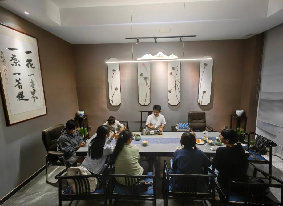 7月21日下午,实践队抵达江西省靖安县城,到访靖叶白茶体验馆,了解当地白茶产业,体味白茶文化。端坐于古风古韵的茶室中,实践队员静心欣赏茶艺师的泡茶过程,聆听茶艺师的讲解。根据茶艺师的介绍,靖安白茶大多采自海拔400米左右的三爪仑国家森林公园。当地生态环境优越,同时茶树品种为野生树种,因此白茶的氨基酸含量较高,还有助于消化。