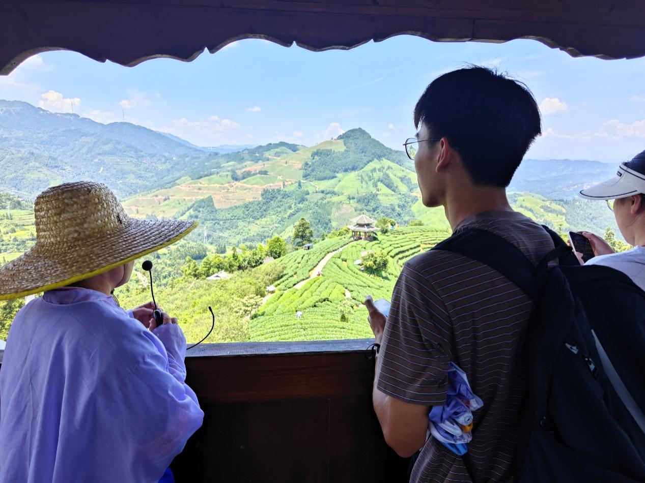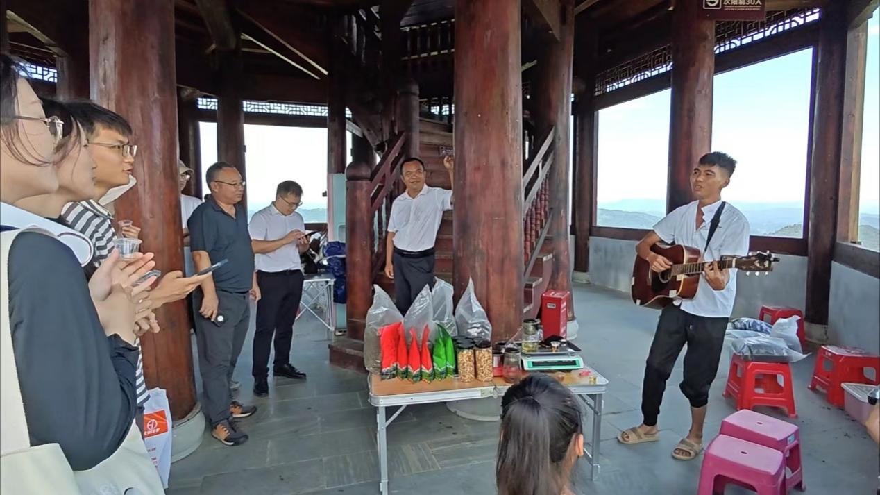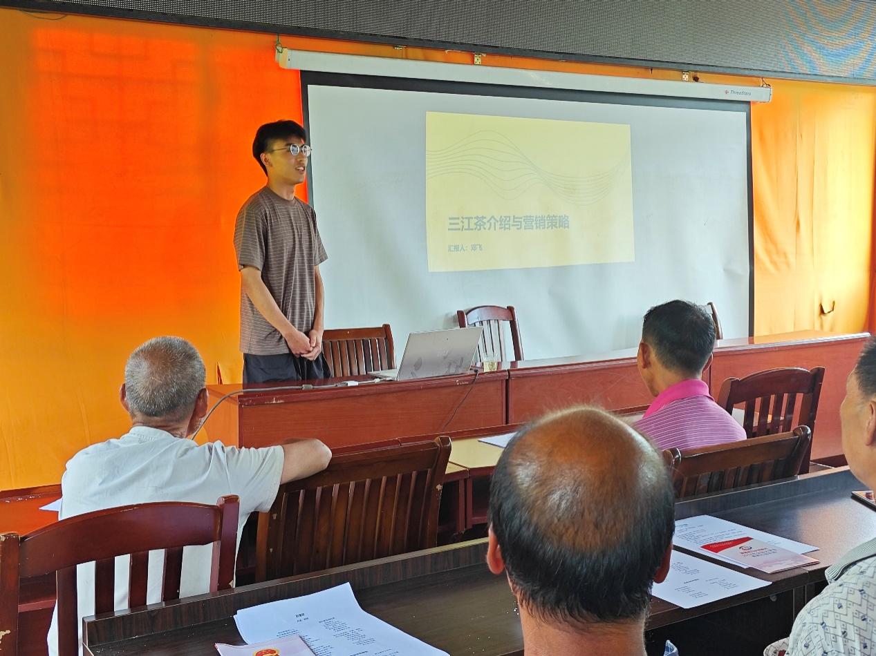 八江镇布央村位于三江县城西北处,这里以侗族为主要少数民族,以茶叶种植为主要农产品产业,其茶园分布于布央仙人山里海拔600-1000米的山腰中,面积达3600余亩。队员们在当地村民的带领下参观了布央仙人山中的茶园景观,在茶园里与当地电商主播互动,在村内店铺、作坊等了解当地制茶技巧及主要茶产品,并就茶叶网络销售推广的电商运营技巧与茶农们进行分享交流。