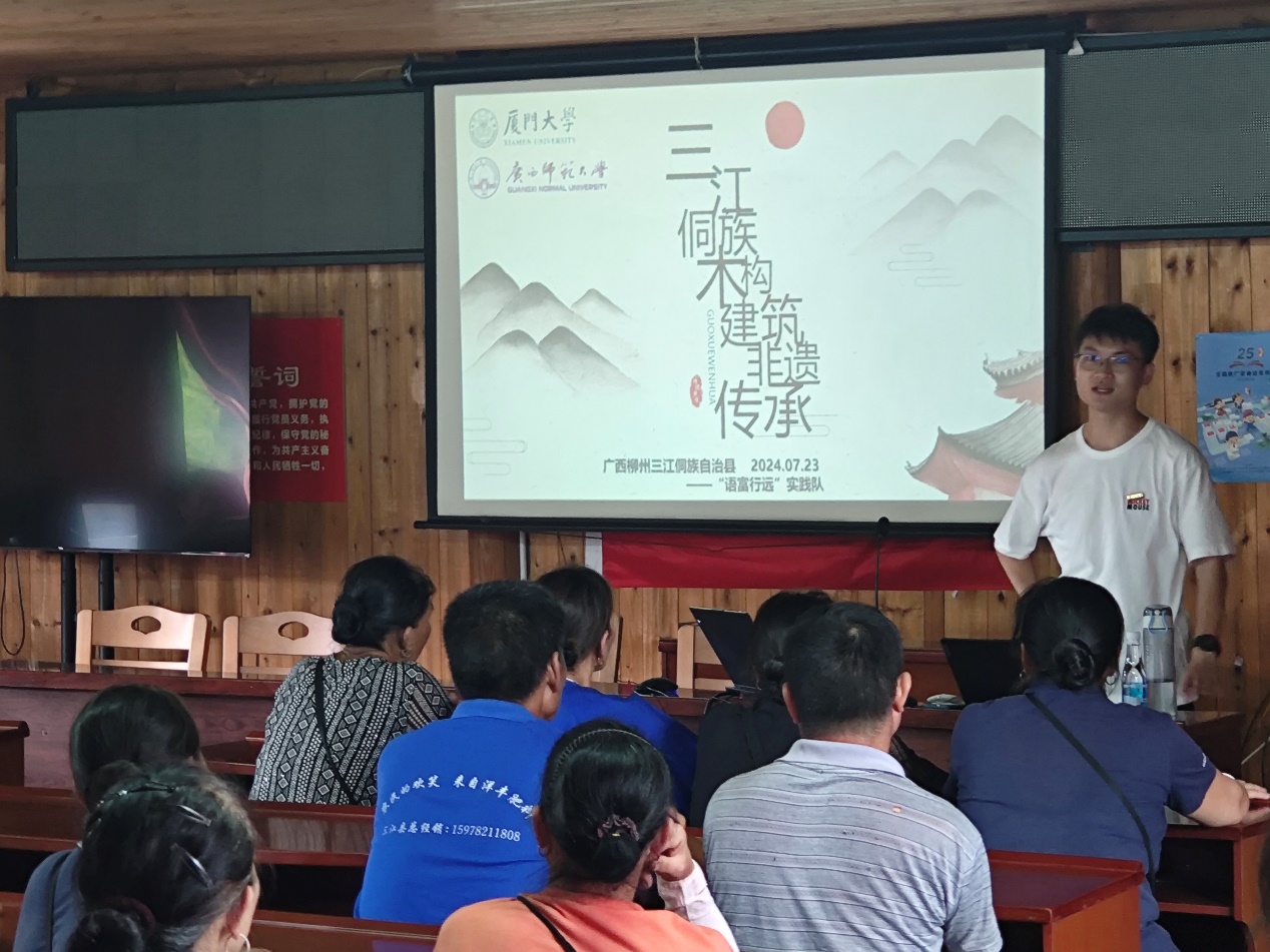队员们亦做足功课,立足木构建筑技艺的历史回顾和传承现状,以“三江侗族木构建筑非遗传承”为题与当地群众交流,向村民讲解非遗文化传承的重要性和必要性——“只有侗寨才有鼓楼,凡有鼓楼必是侗寨,这是一种文化自信”。在主题交流会中,队员们列举了一些创新性的非遗传承方式,包括加强文化挖掘力度、利用职业院校推动技艺的传承与创新、探索定制侗族木构建筑营造的地方性技术标准等,引发了实践队员和当地群众的进一步思考和讨论。