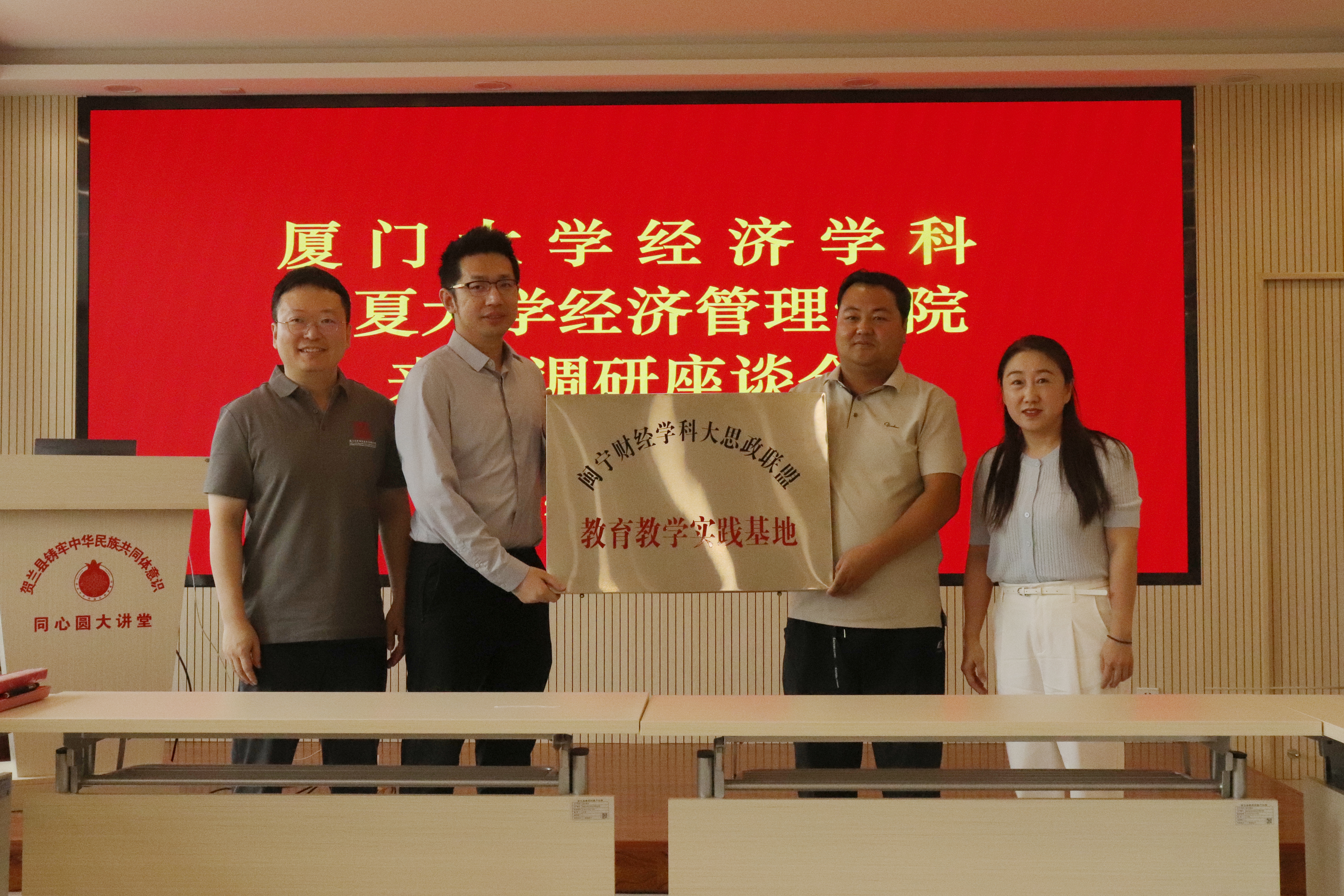 厦门大学经济学科与贺兰县签署共建实践基地协议,闽宁财经学科大思政联盟向贺兰县金贵镇授“闽宁财经思政大联盟教育教学实践基地”牌匾。此次厦门大学经济学科、闽宁财经学科大思政联盟与贺兰县共建社会实践基地,是深度合作的开始,通过建设实习实训和联合培养基地,重点在科研延伸、智库合作、人才培养、党建联动、示范引领等方面形成合作长效机制,促进闽宁经济社会发展和文化交流,全力推动校地合作结出丰硕成果。