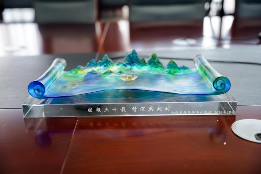 最后,学院向校友们赠送了书籍,校友代表也向学院敬献了“千里江山画卷”的立体水晶琉璃摆台,寓意着无论时光如何流转,校友们对院、系的深情如水晶琉璃般清澈而坚固,历经岁月洗礼而愈发璀璨。