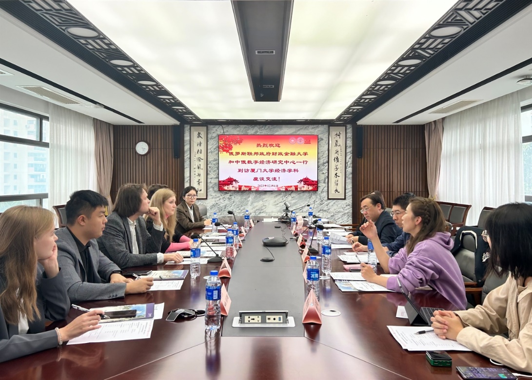 周颖刚教授首先对嘉宾的到来表示欢迎,并从院系专业设置、国际化建设等方面介绍了经济学科概况。俄罗斯财政金融大学代表对其国际经济关系学院(Faculty of International Economics Relations)的项目课程设置、学生汉语学习情况、与中国高校合作情况等进行介绍,与会人员就厦门大学经济学科与俄罗斯财政金融大学联合组织学术会议、推广国际硕博士项目、合作双学位及交换交流项目等进行了细致探讨。